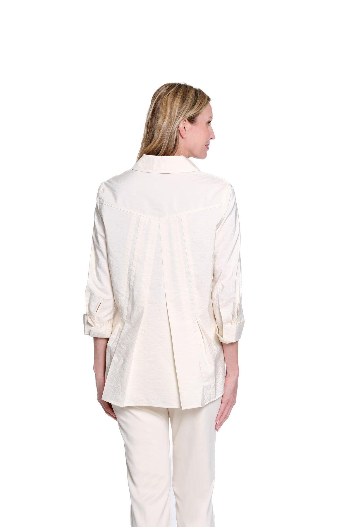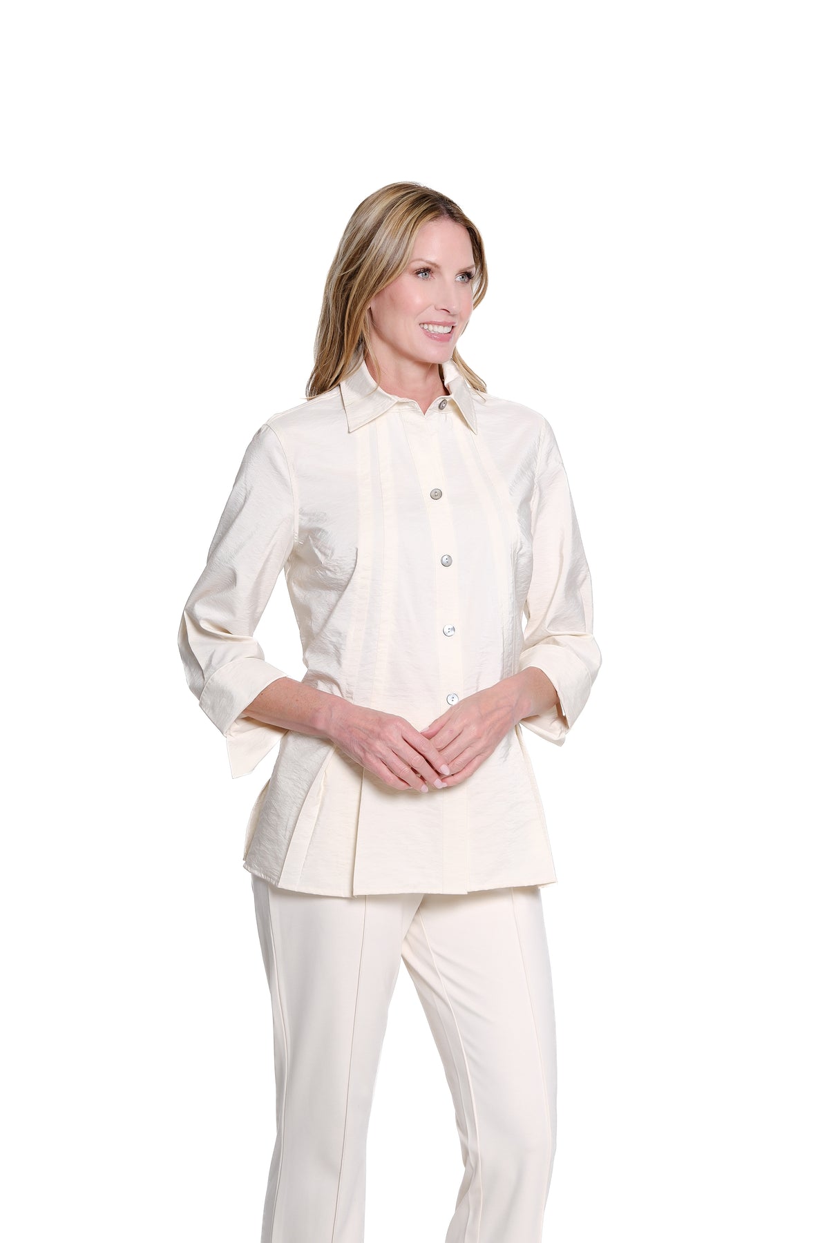 Effortless texture meets polished style in this crinkle shirt. Featuring 3/4 sleeves with cuffed detailing and a button-front closure, it’s designed with subtle tucks for a flattering, tailored silhouette. Crafted from a lightweight polyester/nylon blend, it’s perfect for layering or wearing on its own.