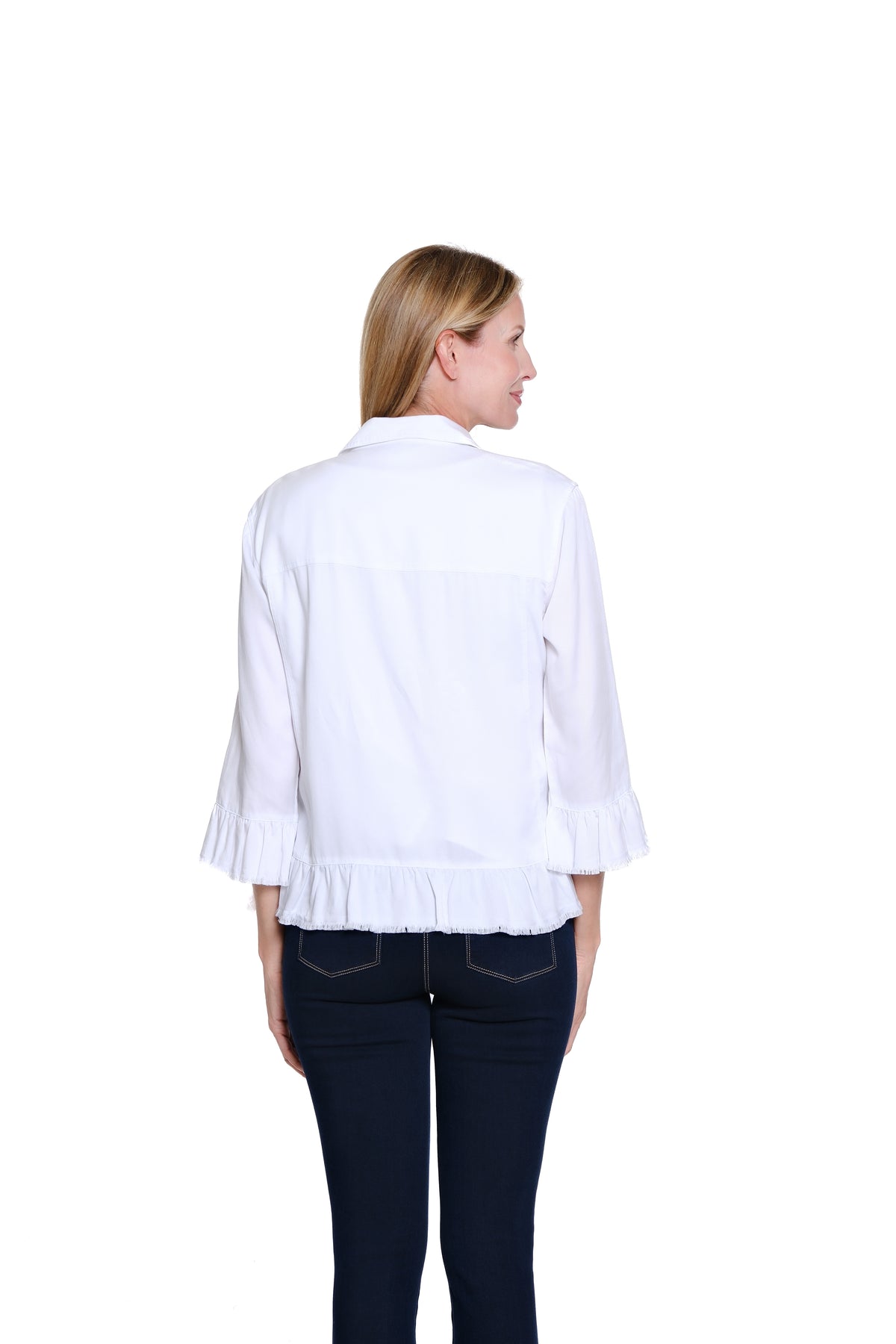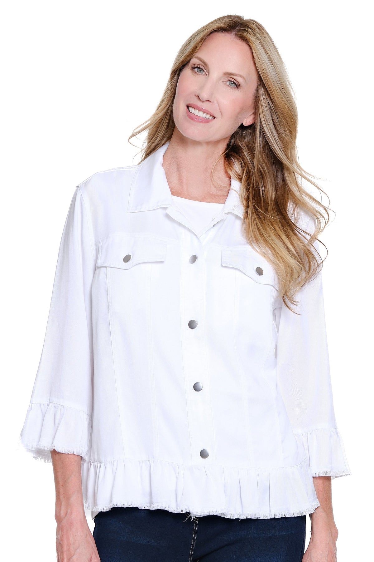 Softly structured with a feminine twist, this woven jean jacket is crafted in fluid lyocell for a lightweight, refined feel. A clean silhouette is elevated by a gently ruffled hem, adding graceful movement and subtle charm. Finished with 3/4-length sleeves, it offers an easy, polished layer designed for everyday elegance.