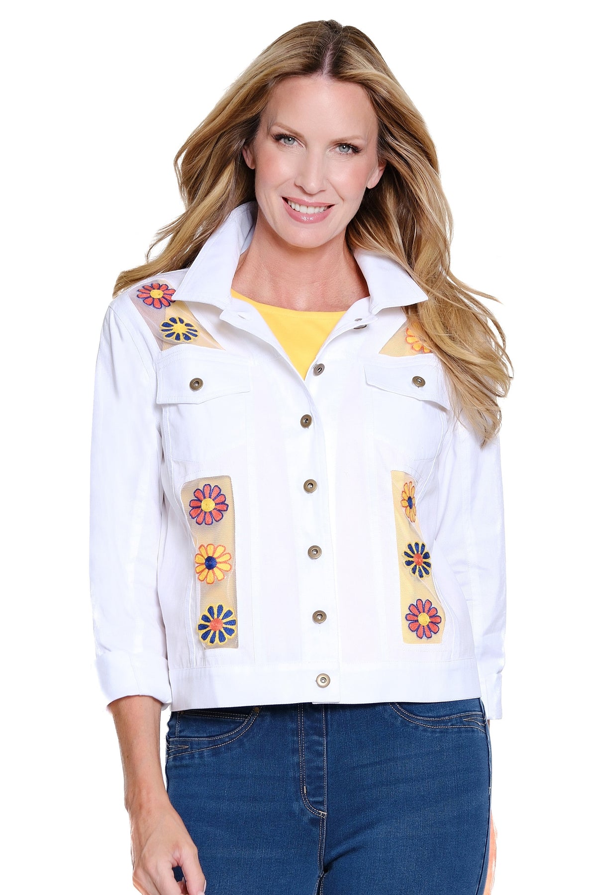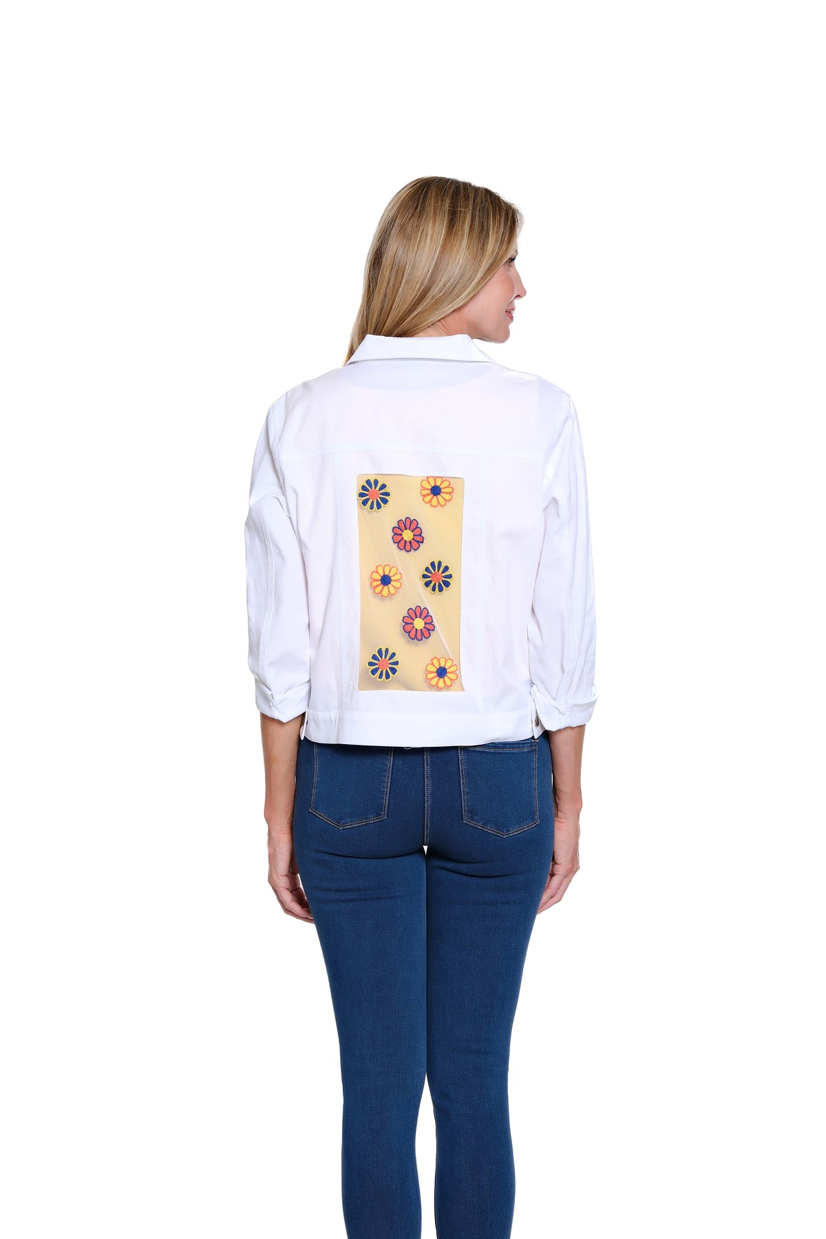 Blending texture and tailored detail, this jacket pairs structured twill with mesh accents for a modern, dimensional look. Delicate embroidery adds a refined, feminine touch, while the button-front design and two front pockets provide classic utility. Finished with cuffed long sleeves and a button-tab back for subtle shaping, it’s crafted in breathable cotton for comfortable, polished layering.