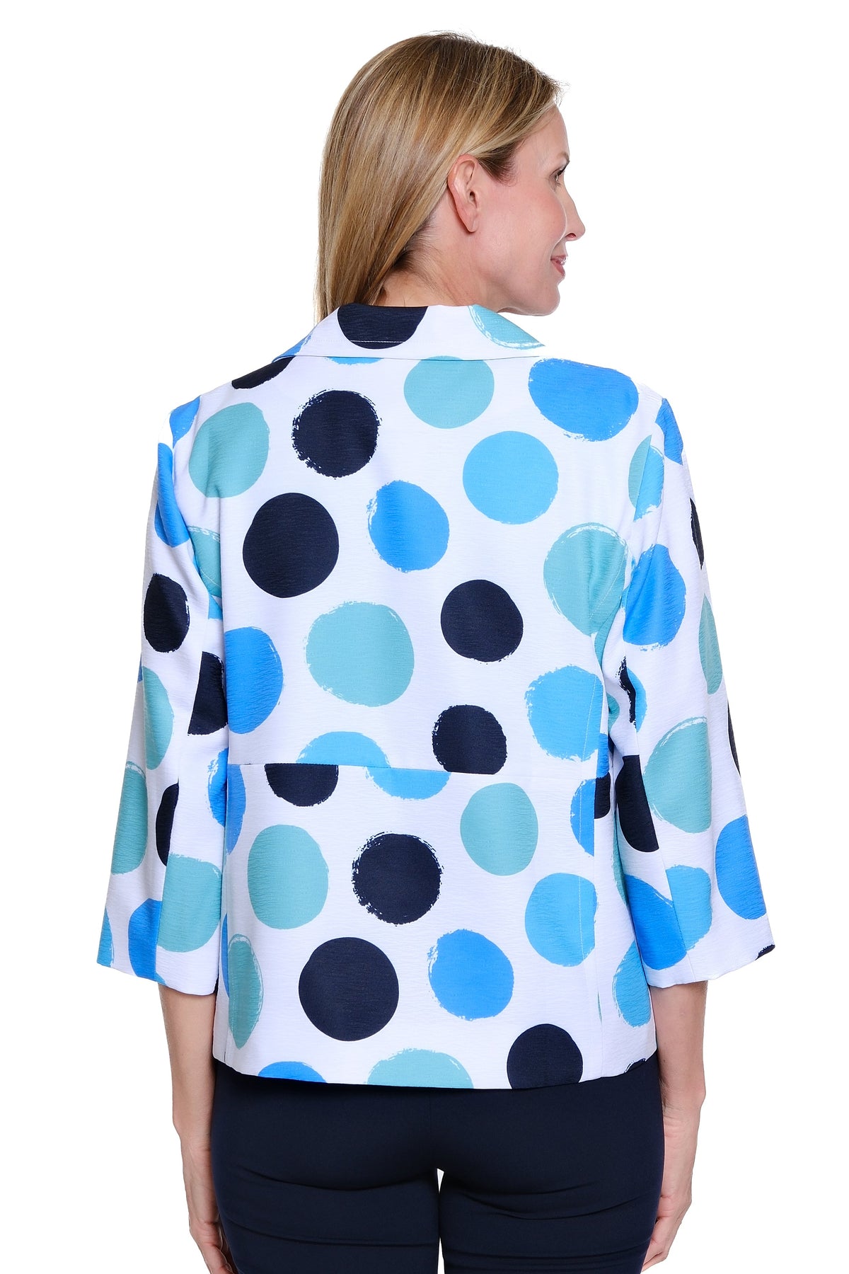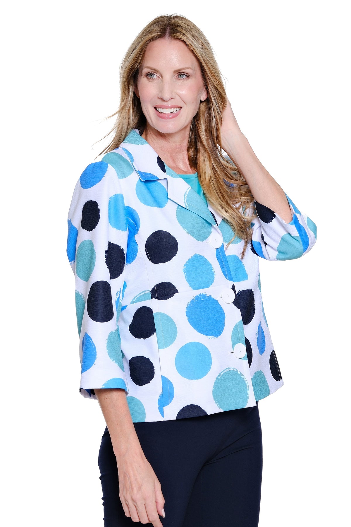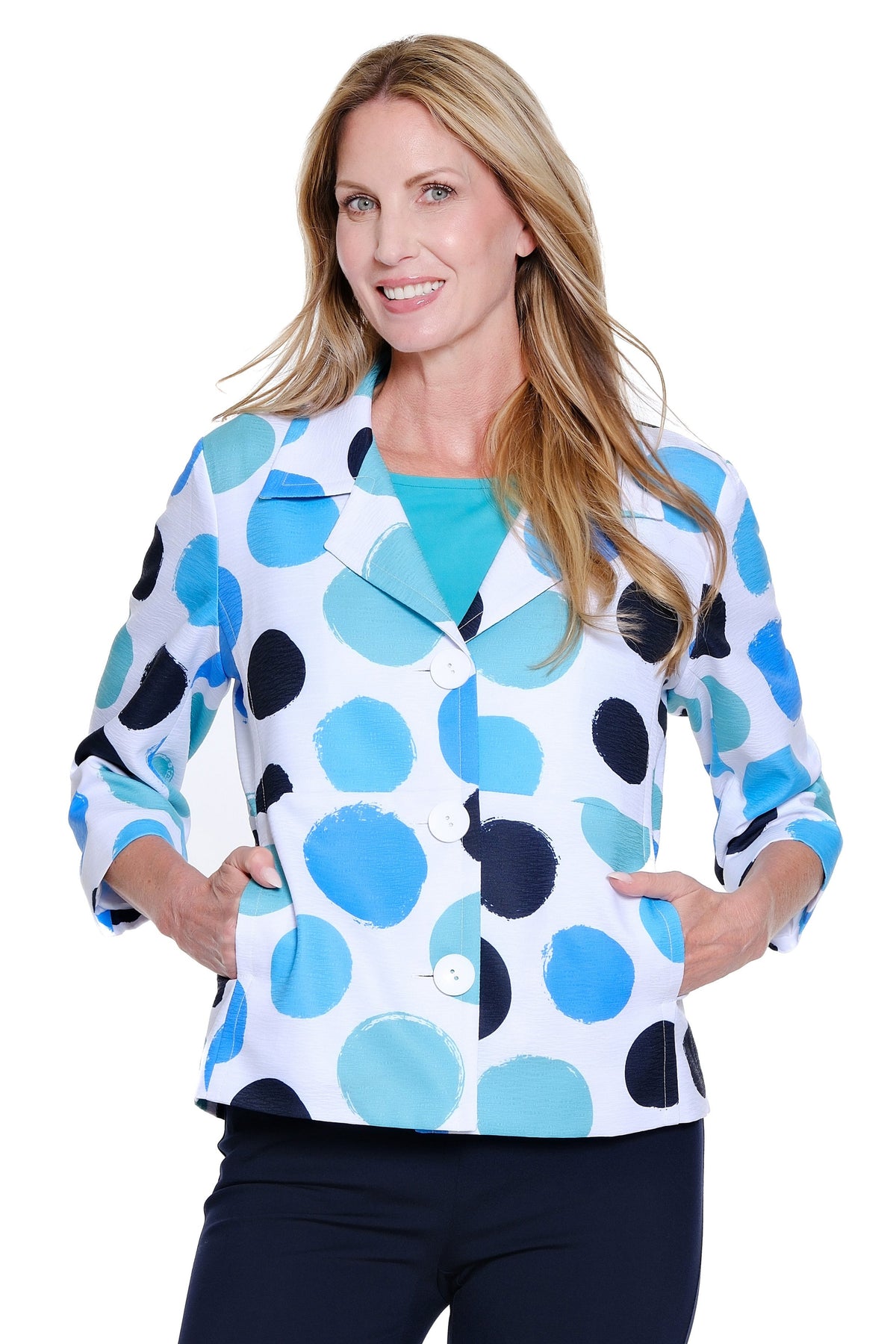 Tailored with timeless sophistication, this lined bark cloth jacket features a distinctive printed design that adds depth and character to a polished silhouette. A classic lapel collar and three-button front closure lend structured elegance, while 3/4-length sleeves offer versatile wear. Crafted in durable polyester, it provides refined texture with comfortable, lightweight layering.
