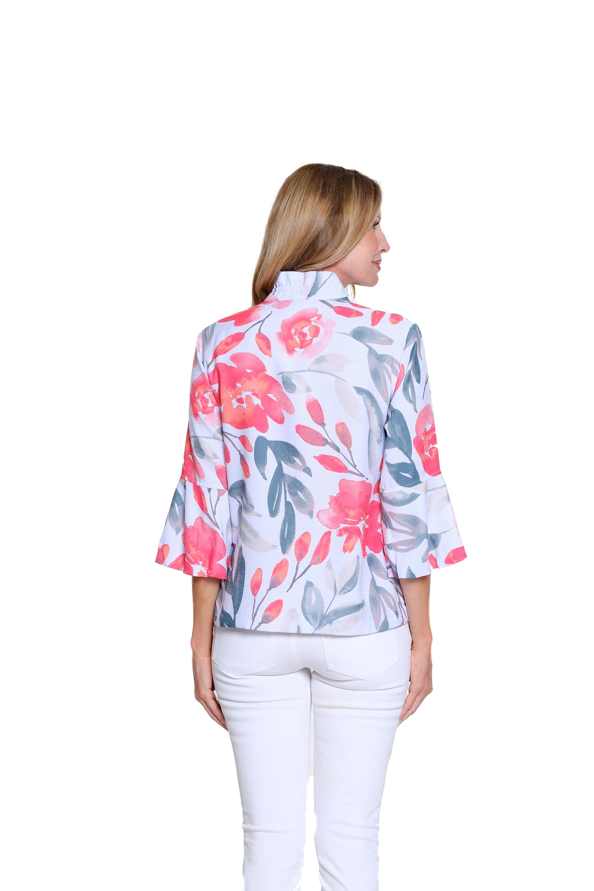 Elegantly tailored with distinctive texture, this lined bark cloth jacket features an artful print that adds depth and character to a refined silhouette. A wire collar allows for customizable shaping, while 3/4-length puff sleeves introduce soft volume and feminine detail. Finished with a button-front closure and front pockets, it offers polished structure with everyday versatility.