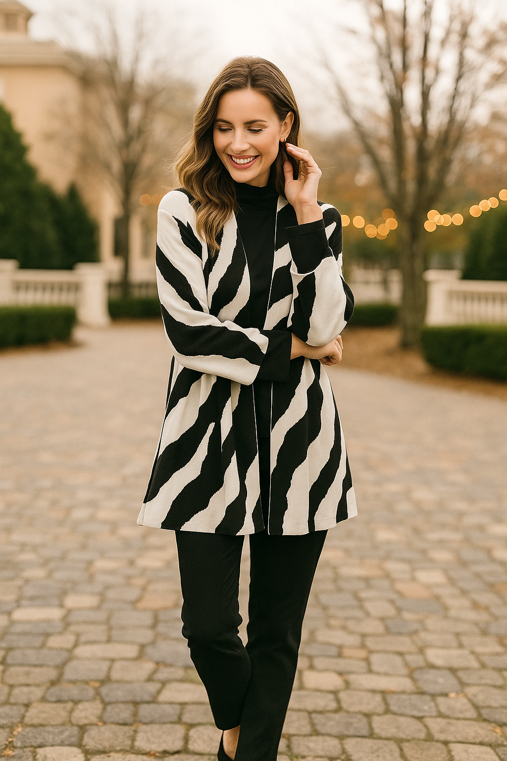 Bold yet cozy, this zebra pattern jacquard cardigan brings effortless style to any outfit. Designed with a relaxed drop shoulder, shawl collar, and open front, it drapes beautifully for easy layering. The soft rayon knit ensures comfort and all-day wearability with a touch of statement flair.