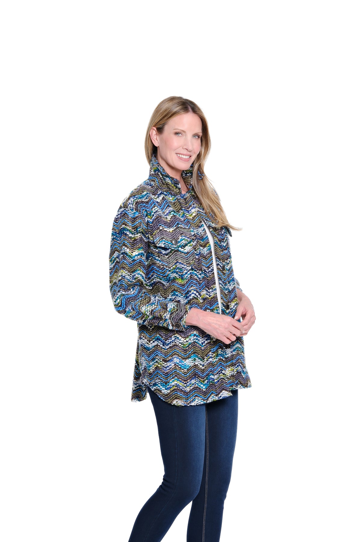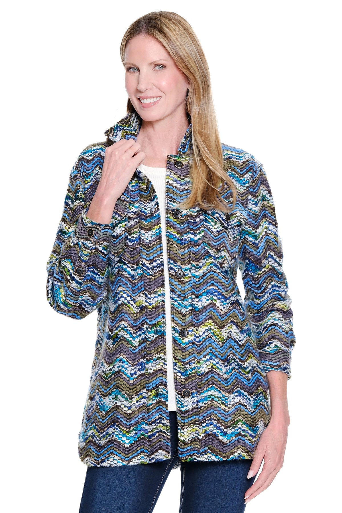 Effortlessly blending jacket structure with shirt comfort, this embroidered shacket features a bold chevron pattern and cuffed long sleeves. Button-front closure and two front pockets provide practicality, while the soft poly/acrylic blend ensures warmth and all-day wearability. A statement layer perfect for transitional seasons.