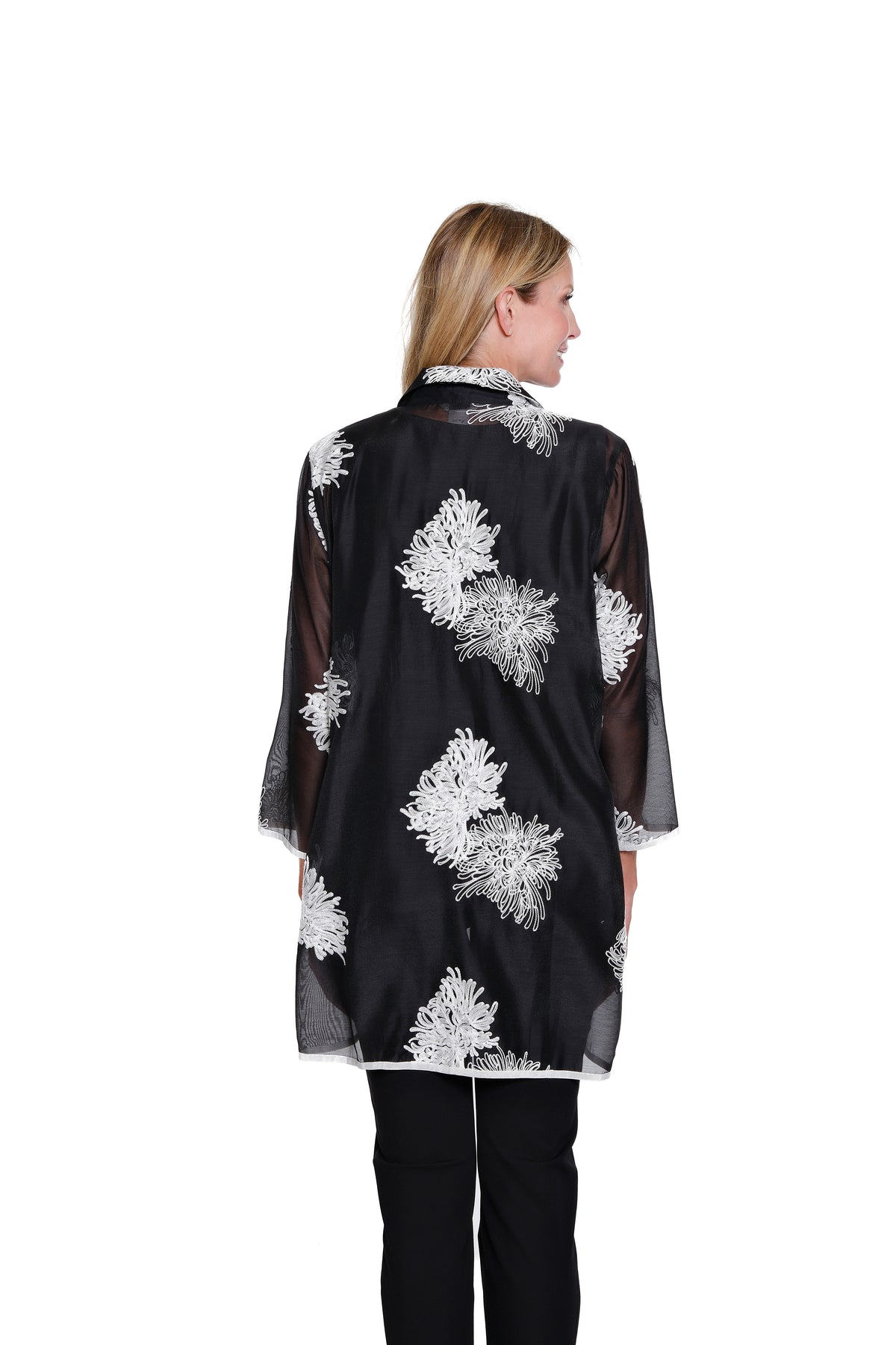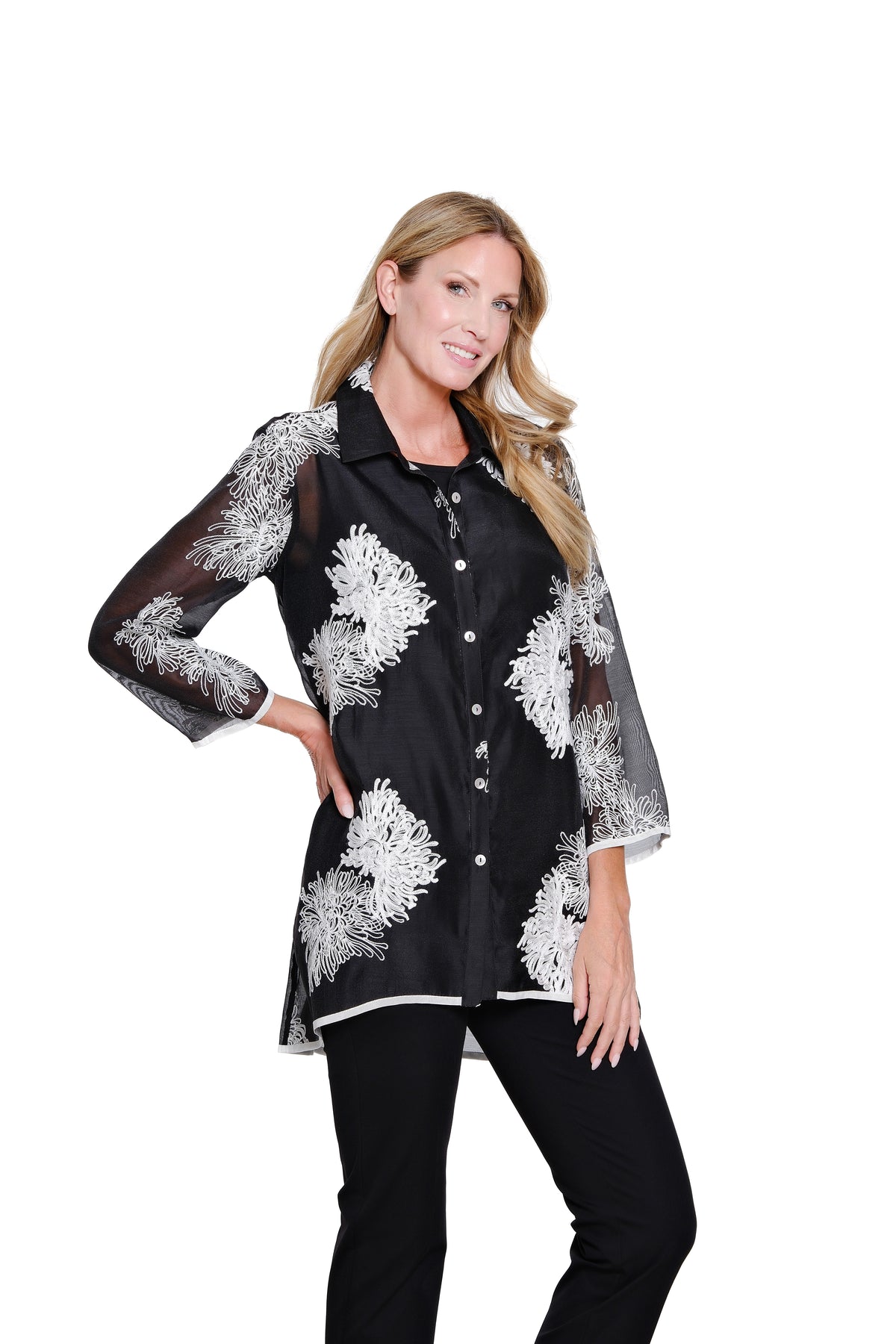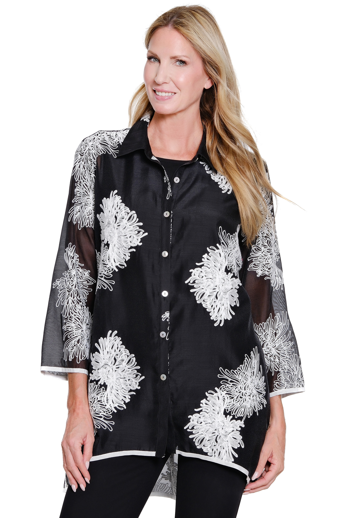 Light and beautifully detailed, this crinkle sheer shirt is adorned with allover embroidery that adds soft texture and artisanal charm. The button-front silhouette is complemented by 3/4-length sleeves and a hi-low hem, creating graceful movement and an effortlessly polished look. Crafted in airy polyester, it’s a delicate layering piece designed for refined everyday elegance.