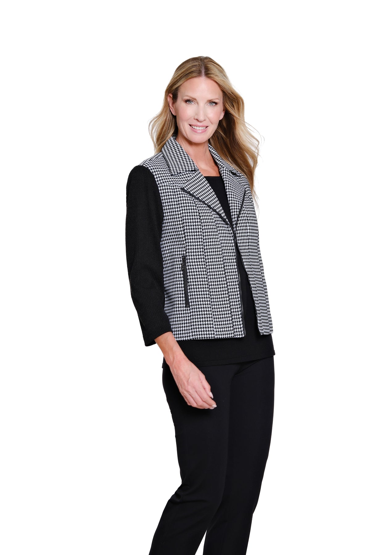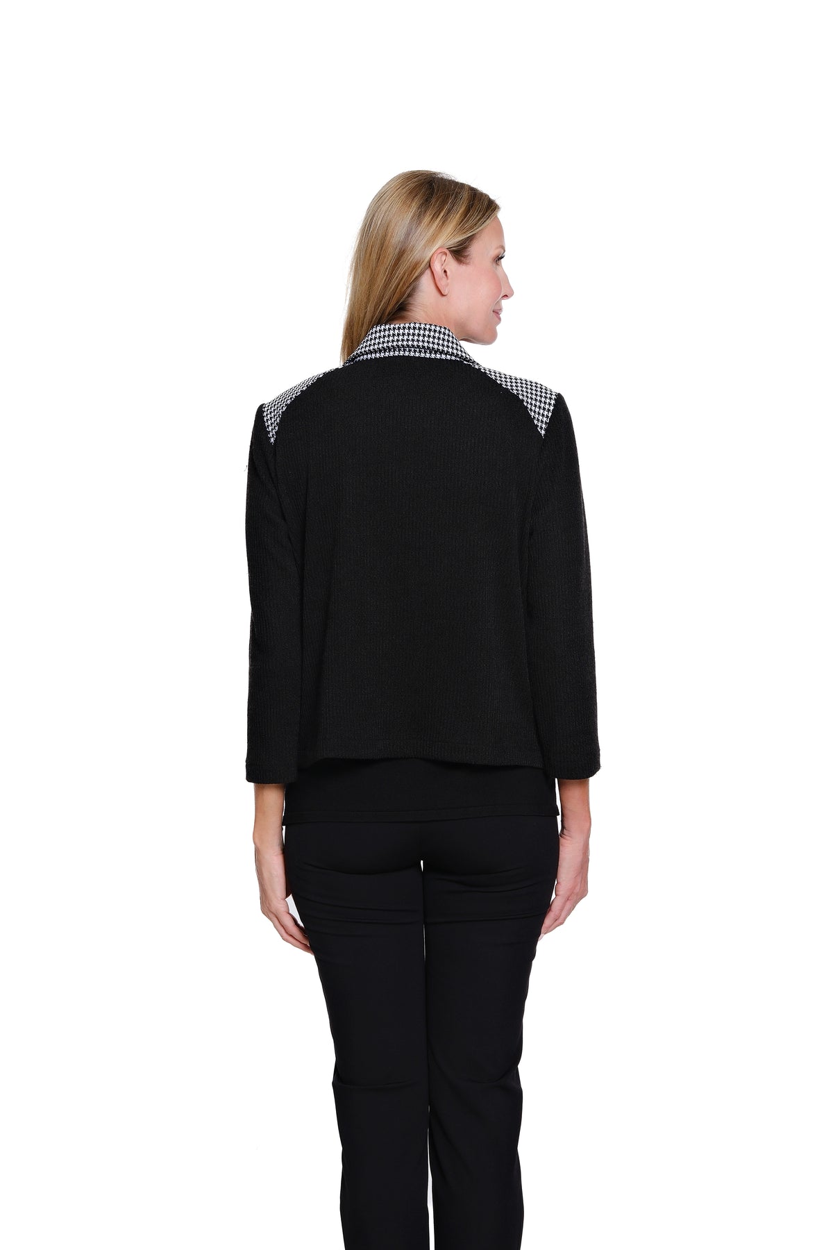 Tailored with a modern edge, this open-front knit jacket blends classic menswear influence with contemporary ease. A lapel collar and hook-and-eye closure create clean structure, while faux zip-front and faux zip pocket details add sleek, streamlined appeal. Finished with 3/4-length sleeves and solid rib knit accents, it’s crafted in a comfortable poly-blend with stretch for polished layering that moves effortlessly from day to evening.