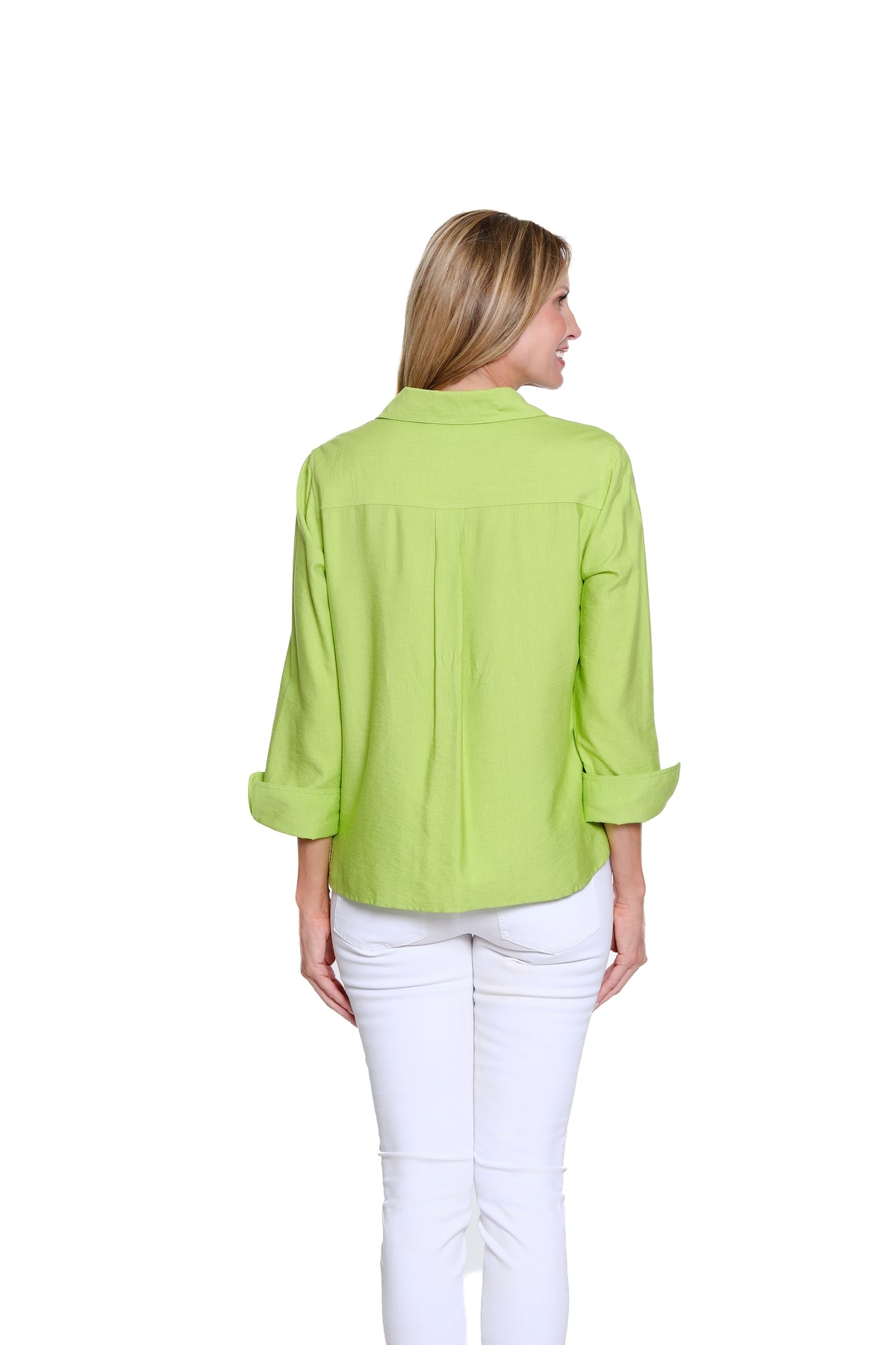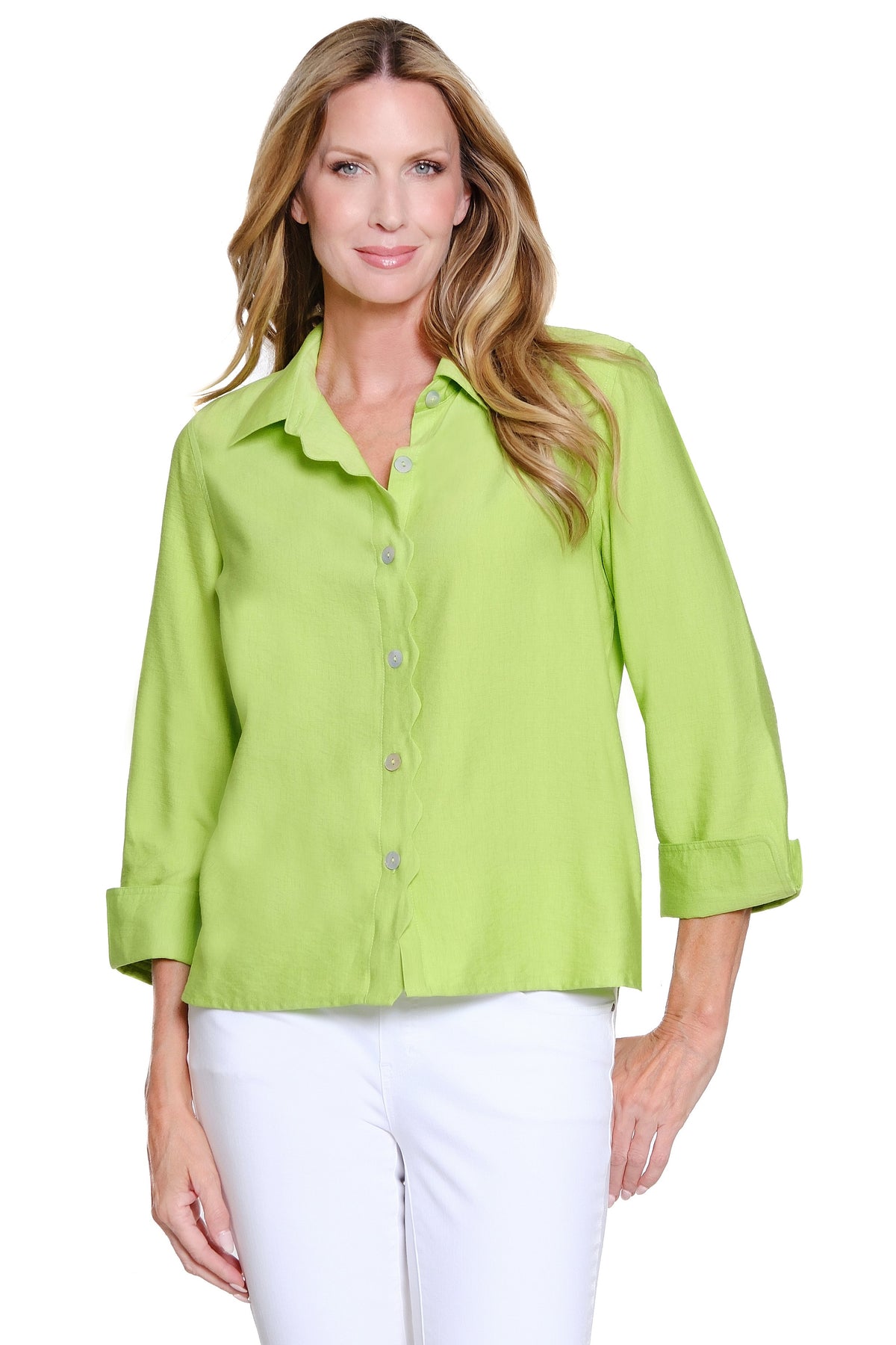Delicately refined with feminine detail, this solid woven shirt features a scalloped button-front placket that adds a soft, decorative touch. 3/4-length sleeves with curved turn-up cuffs enhance its graceful silhouette, offering both structure and versatility. Crafted in a smooth rayon-nylon blend, it drapes beautifully for polished, everyday elegance.