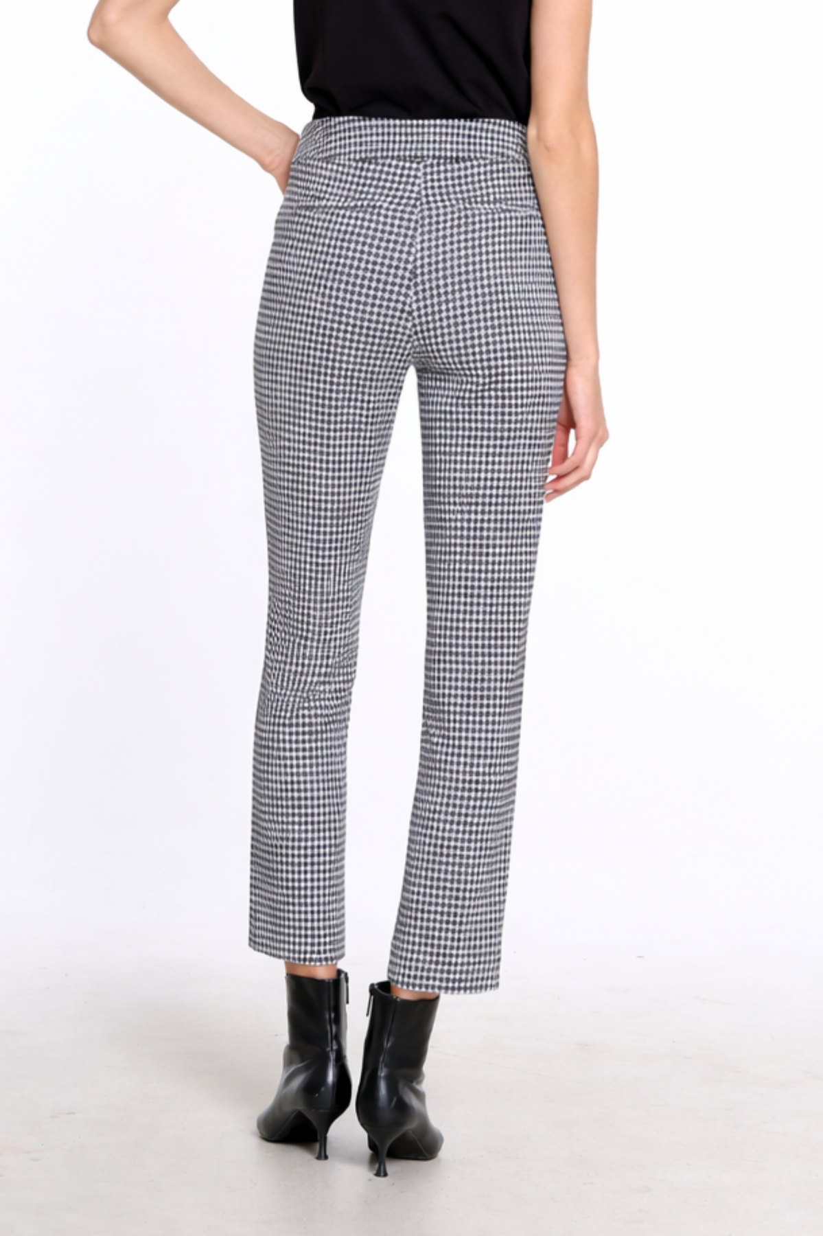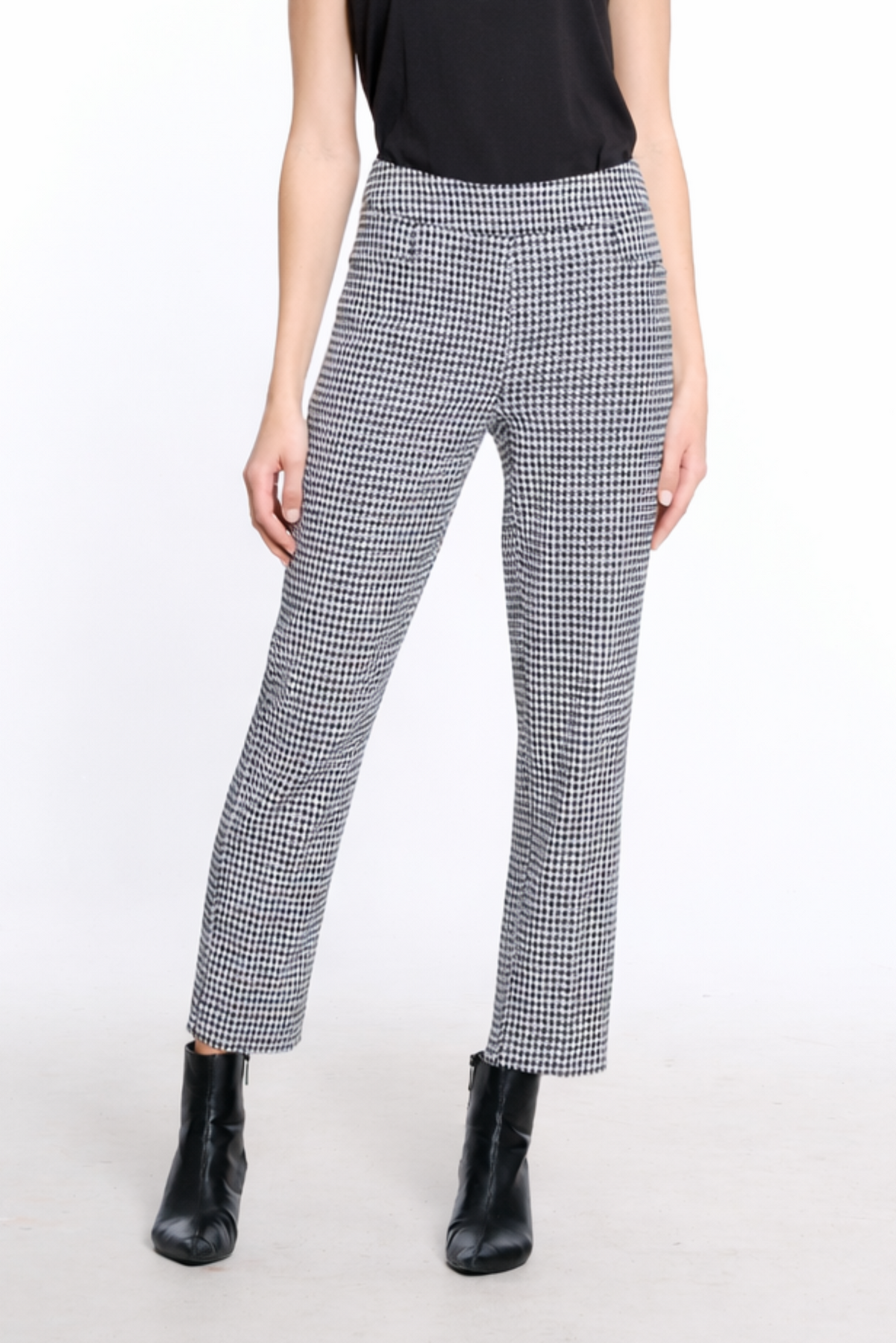 Tailored with a modern sensibility, this pull-on ankle pant features a classic menswear check reimagined for effortless, feminine wear. Designed with real front pockets and faux back welt pockets, it balances clean structure with everyday ease. A built-in tummy panel offers smooth support, while the woven fabrication in a poly/rayon/nylon/spandex blend provides comfort, stretch, and a polished finish.