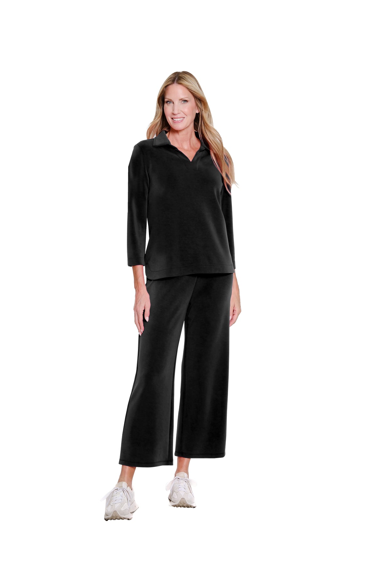 Designed for effortless comfort with a polished finish, this pull-on crop pant features a wide waistband that offers smooth support and a flattering fit. The wide-leg silhouette creates relaxed elegance, while the solid interlock knit provides structure with soft stretch. Crafted in a poly-modal-spandex blend, it delivers breathable comfort and fluid movement for everyday wear.