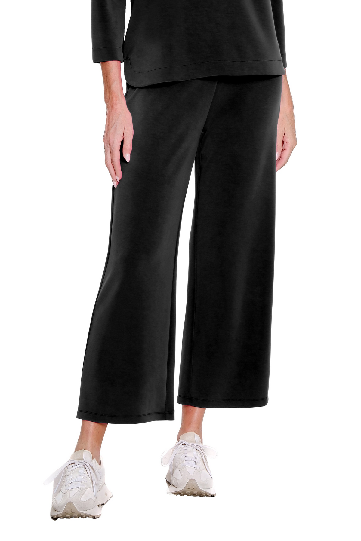 • Pull-on crop pant with wide, supportive waistband