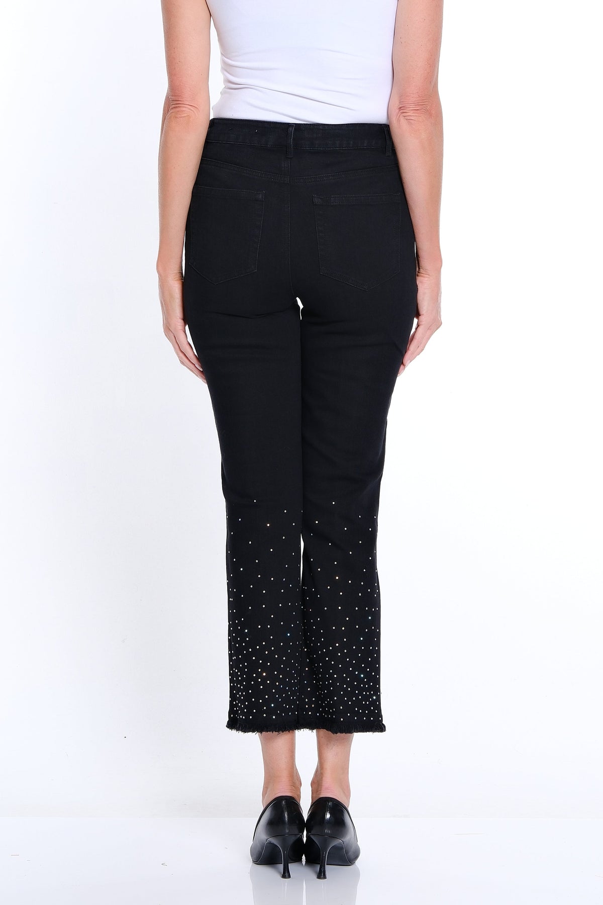 A bold denim statement with a touch of edge. This bootcut flare ankle jean features a released fringe hem and leg embellishments that elevate the classic silhouette. Designed with a zip front, five-pocket styling, and stretch cotton blend, it combines comfort with standout style—perfect for pairing with both casual tops and dressier layers.