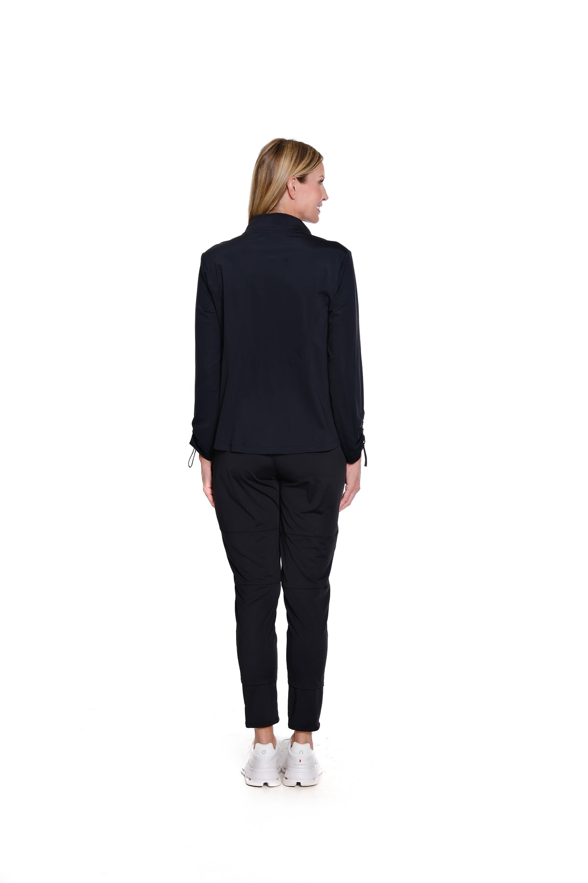 Effortlessly streamlined with modern comfort, this jogger-style ankle pant is designed in smooth jersey knit for an easy yet polished feel. A drawstring elastic waist ensures a customizable fit, while zip pockets add sleek, functional detail. Crafted in a nylon-spandex blend, it offers lightweight stretch and comfortable movement for everyday wear.