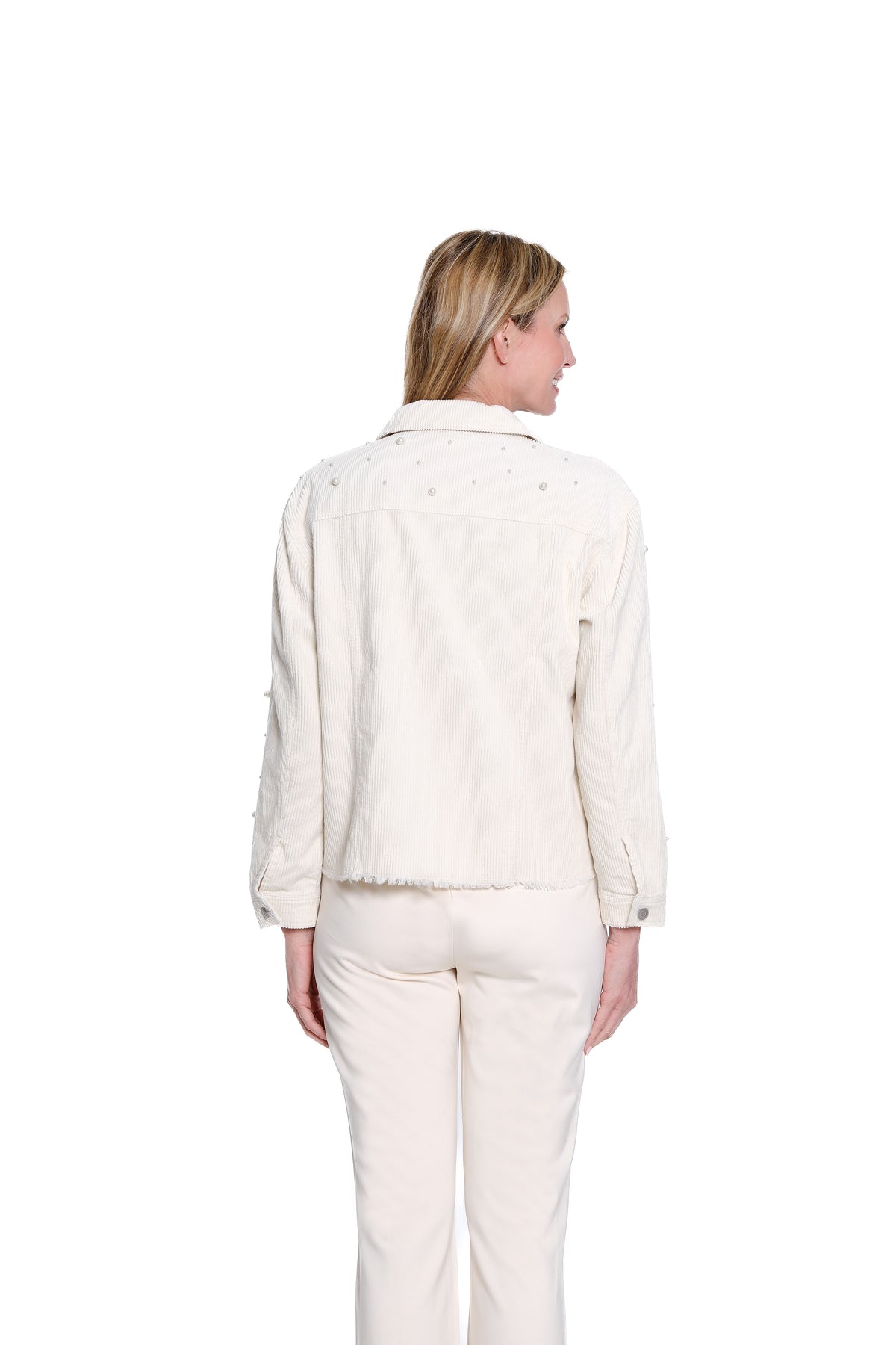 Give your everyday outfits a fun, laid-back upgrade with this soft corduroy jean jacket. Designed with long sleeves and cuffed details, it features a classic button-front look, two handy pockets, and a lightly frayed hem for a touch of effortless edge. Subtle embellishments add just the right amount of sparkle, making this cotton cord jacket perfect for layering over tees, tanks, or casual dresses.