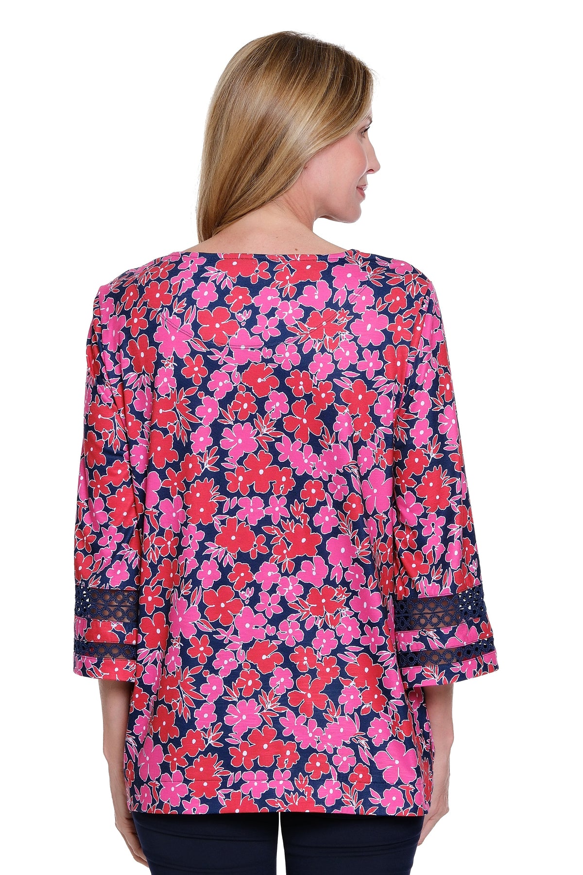 Softly expressive with thoughtful detail, this slub knit top features an artful print accented by delicate lace trim for feminine charm. A wide neckline frames the silhouette beautifully, while side seam buttons add subtle interest and a touch of modern flair. Finished with 3/4-length sleeves and a gently curved hem, it’s crafted in a comfortable poly-spandex blend for effortless elegance and ease.