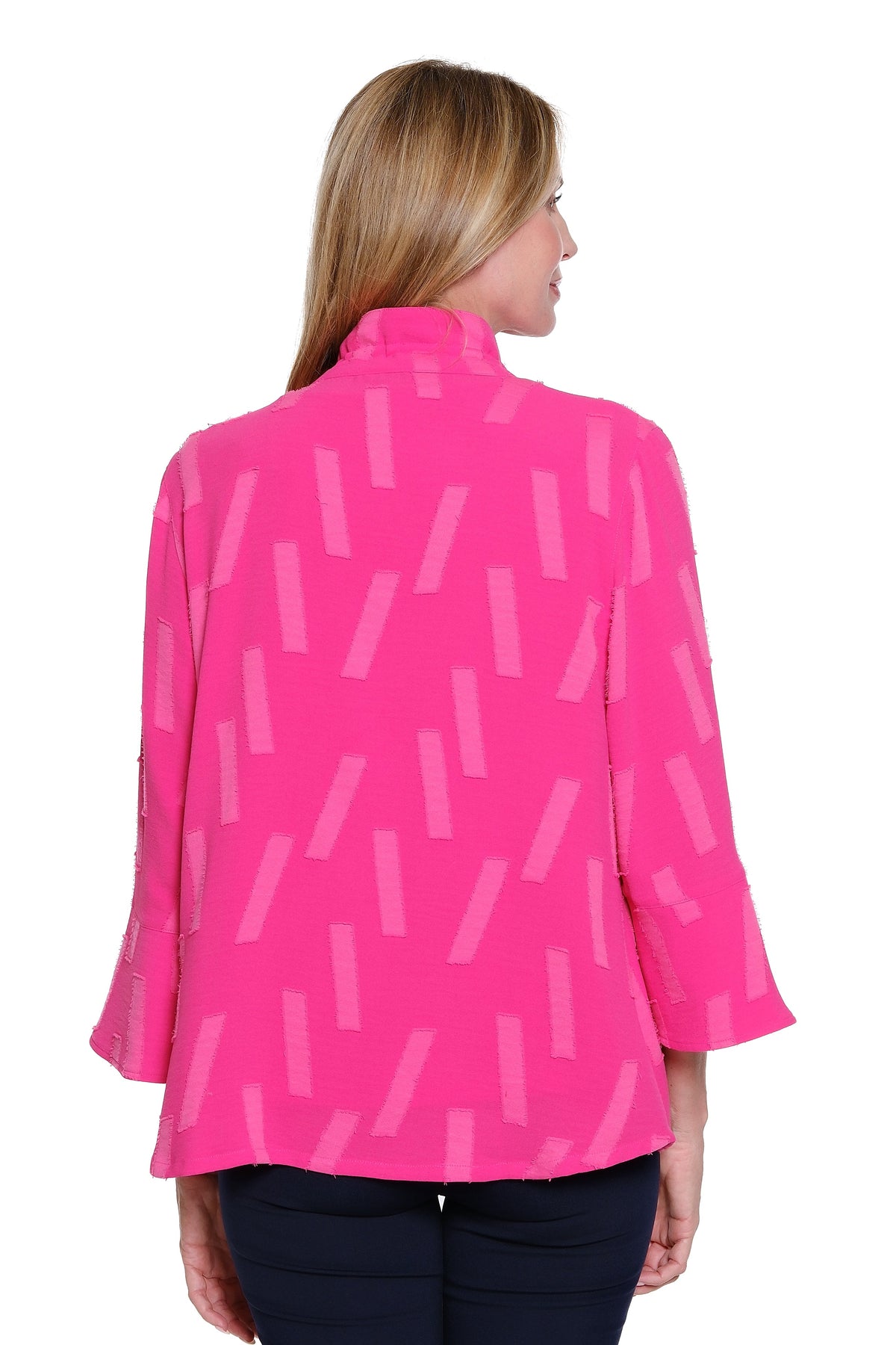 • 3/4-length flounce sleeves add soft, feminine movement