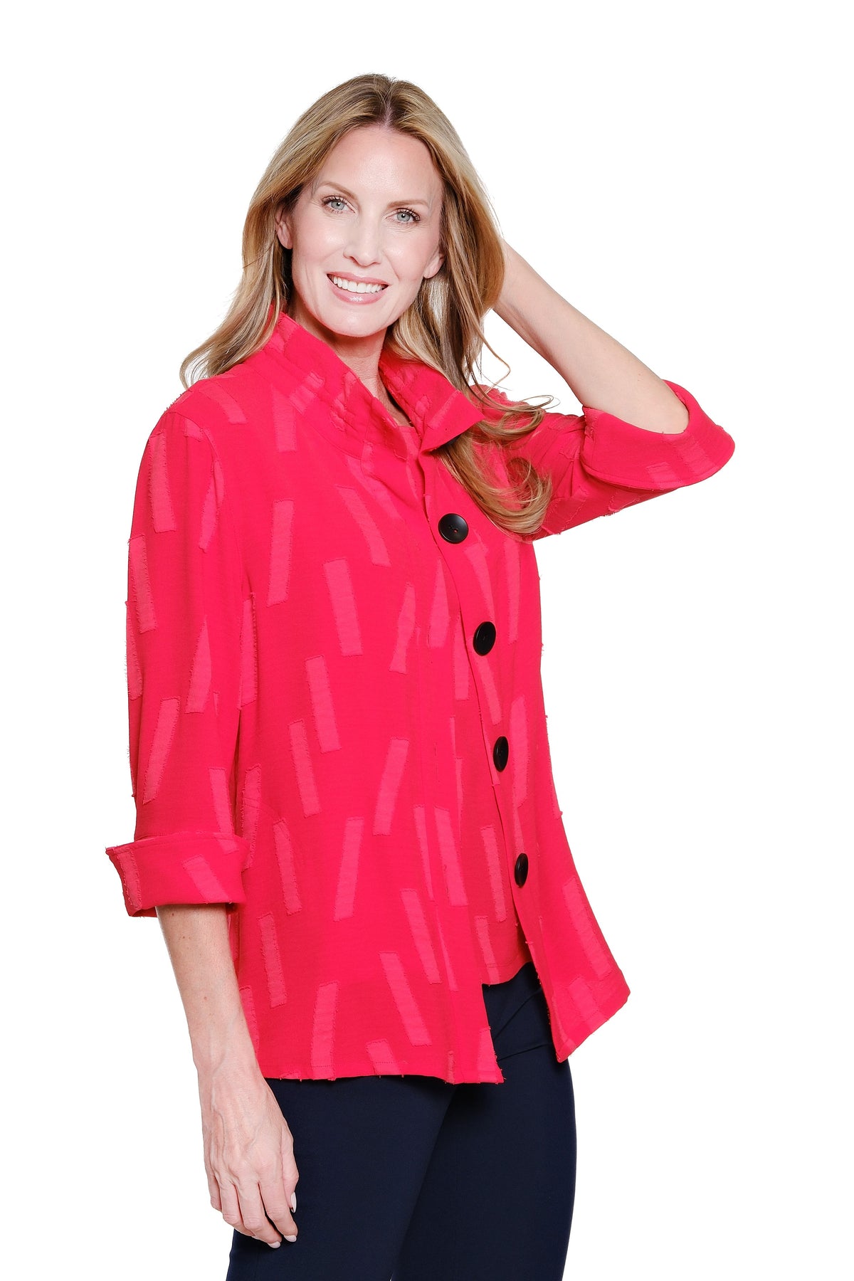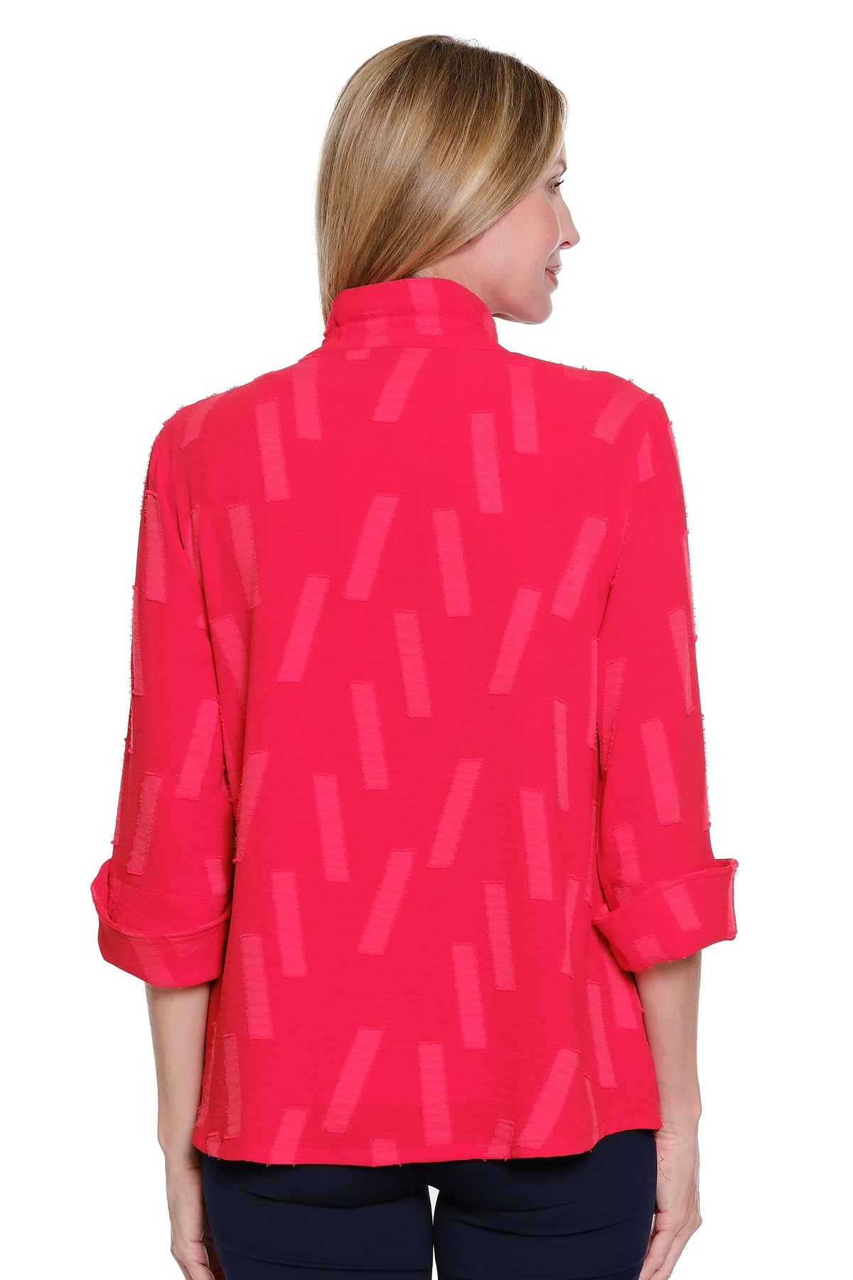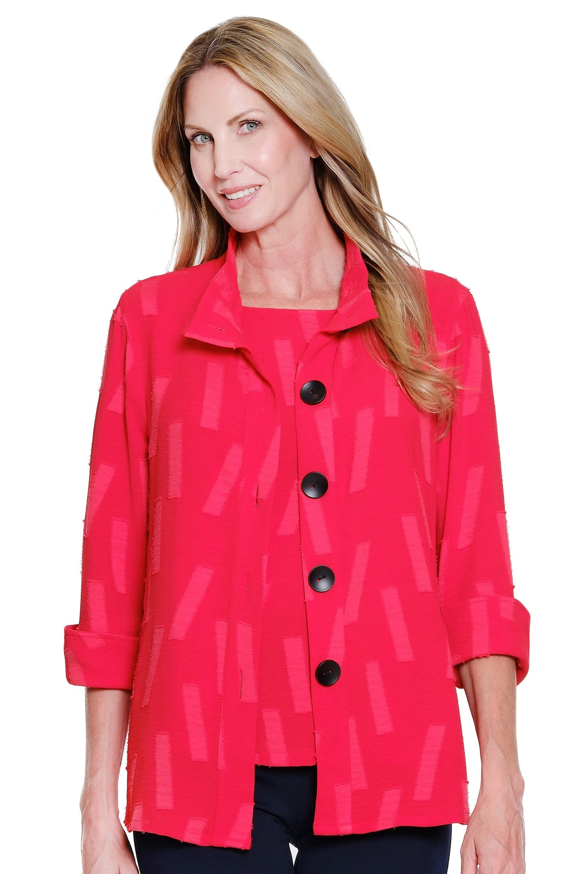 Thoughtfully designed with soft structure and feminine detail, this textured woven jacket offers polished versatility. A wire collar allows for customizable shaping, while 3/4-length flounce sleeves add graceful movement. Finished with functional side seam pockets and paired with a coordinating tank, this set delivers effortless sophistication in a clean, solid palette. Crafted in smooth polyester, it’s a refined layering piece designed for everyday elegance.