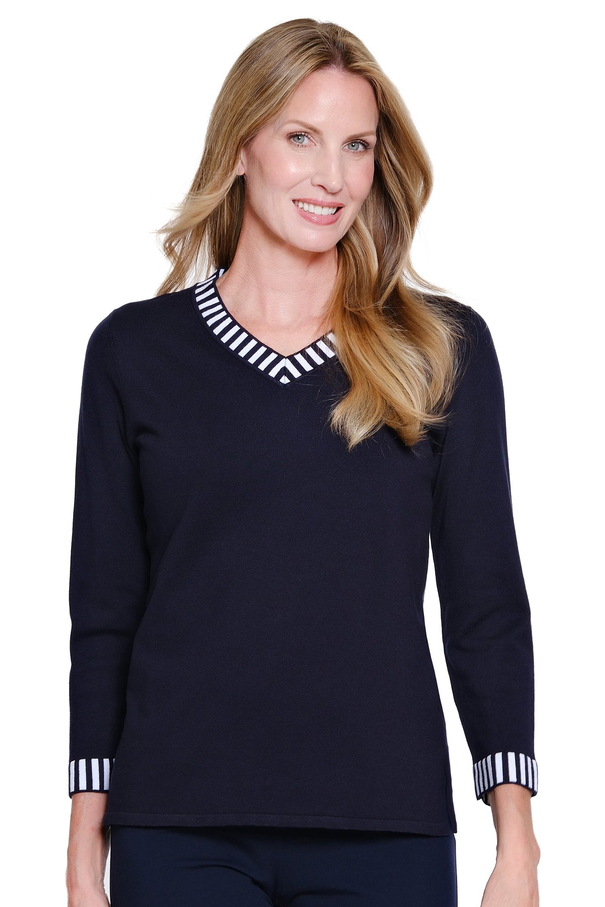 This 3/4 Sleeve Banded V-Neck Sweater Top combines classic style with refined details. Designed with a flattering V-neckline and banded accents, it features contrast trim that adds a subtle pop of visual interest. The solid sweater knit offers a smooth, polished look, while the soft rayon/nylon blend provides lightweight comfort and easy wear.