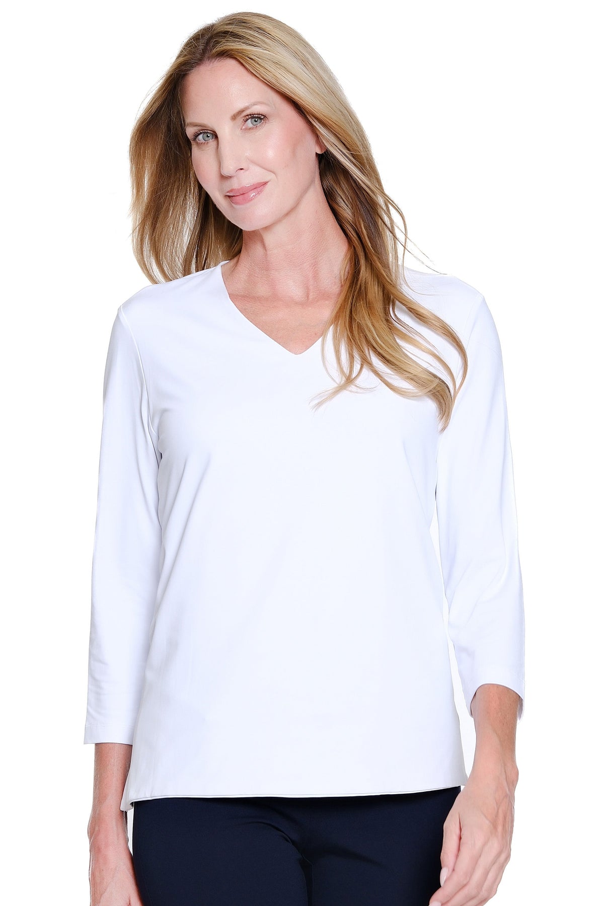 This 3/4 Sleeve V-Neck Top combines everyday comfort with functional performance. Crafted from a smooth solid knit, it offers a flattering drape and a classic V-neckline that’s easy to dress up or down. Designed with built-in UV protection, this versatile top is ideal for both active days and casual outings, keeping you comfortable and confident all day long.
