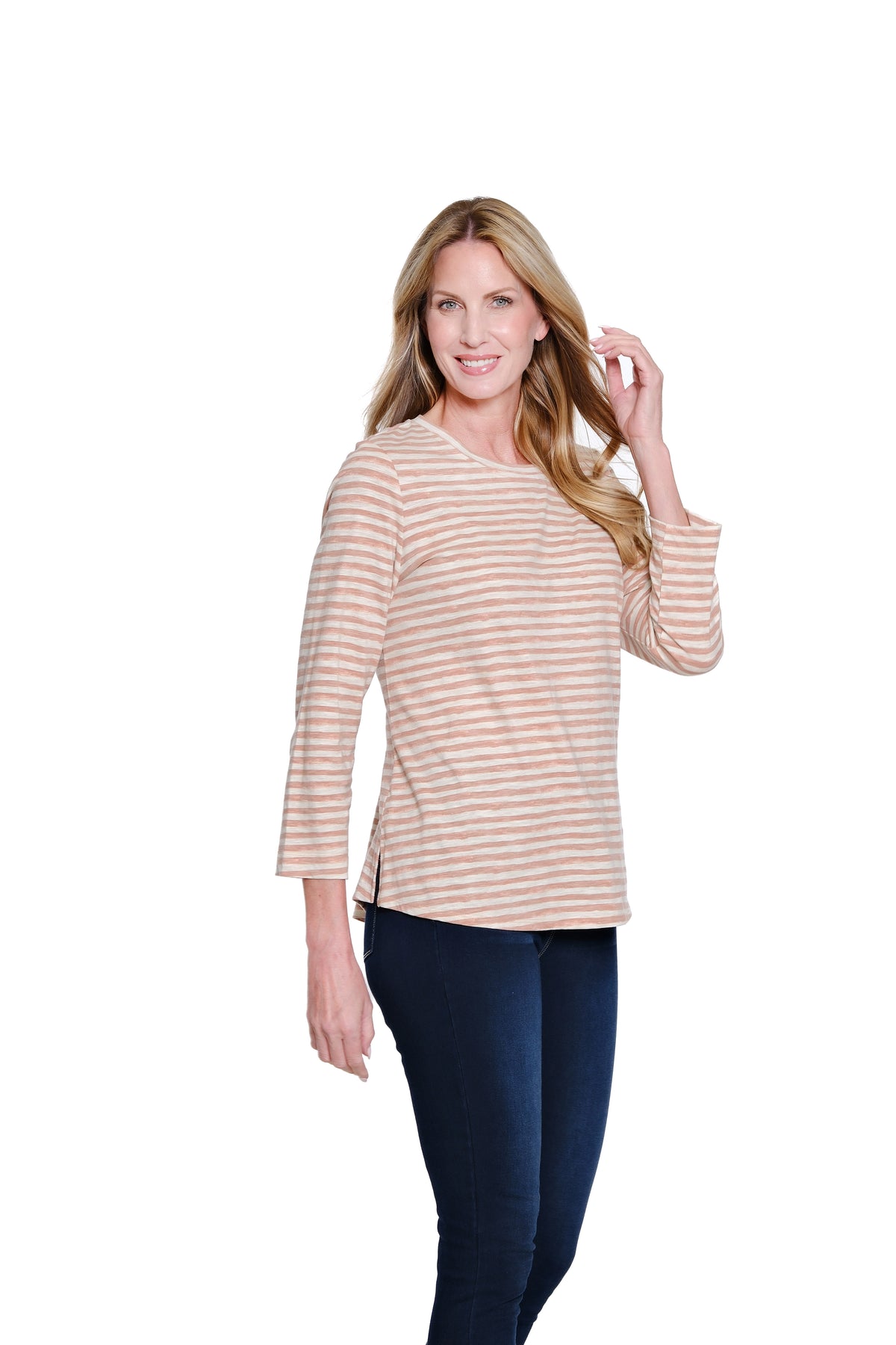 This easygoing top combines everyday comfort with subtle style details. Crafted from soft cotton slub knit, it features a flattering scoop neckline and a printed stripe design for a casual, laid-back look. The 3/4 sleeves and shaped hem create a relaxed yet polished silhouette perfect for daily wear.