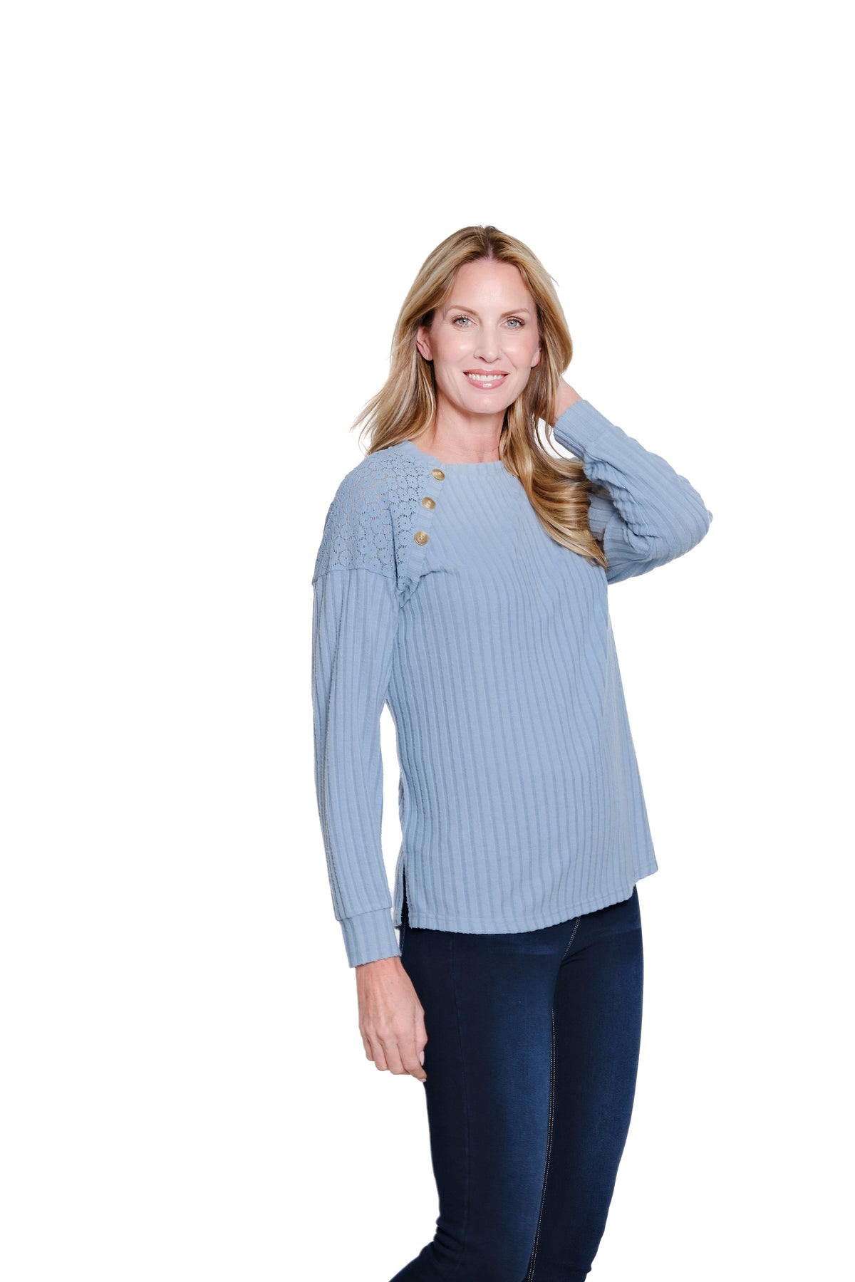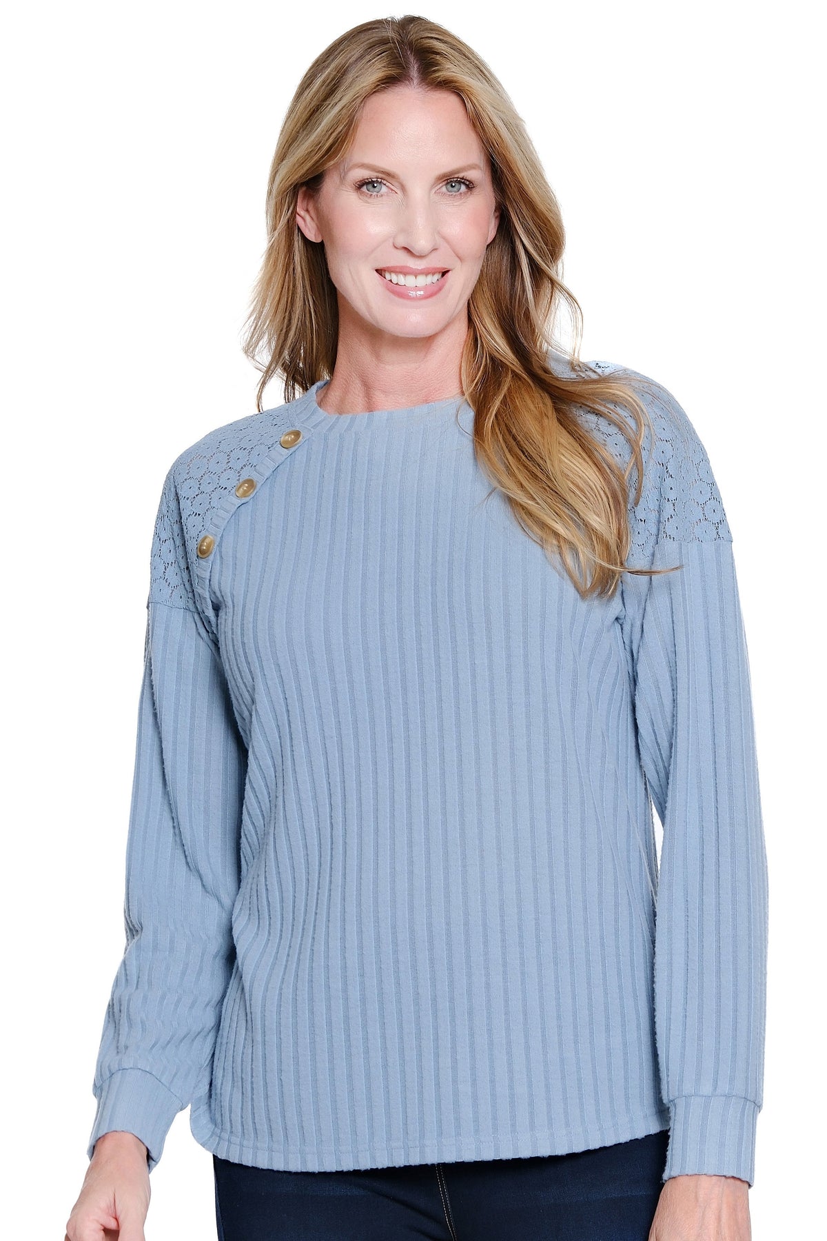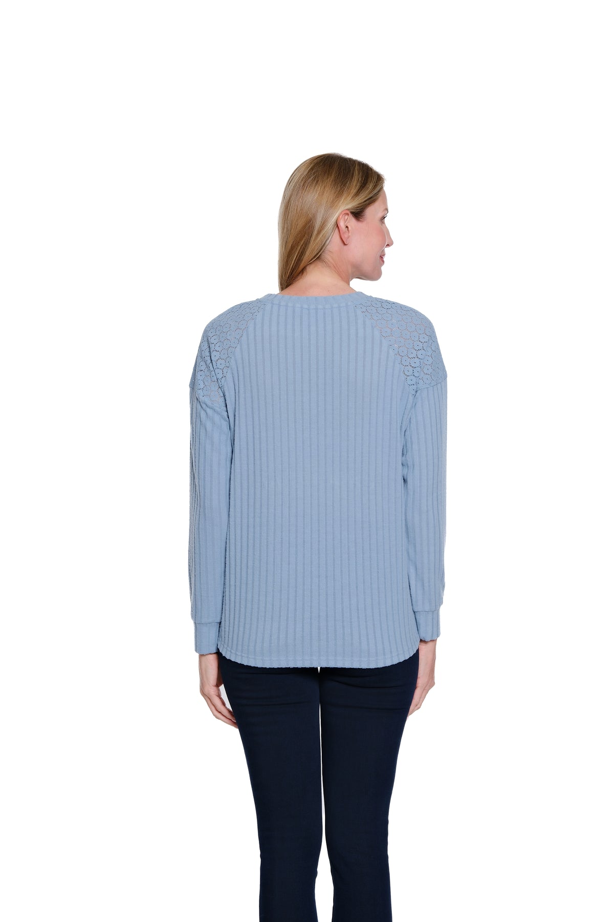 This cozy yet stylish top blends texture and comfort for an elevated everyday look. Designed with a classic crew neckline and relaxed raglan sleeves, it features cuffed long sleeves and a unique mix of solid lace and fuzzy rib knit panels. Soft and comfortable, this top adds subtle dimension while remaining easy to wear.
