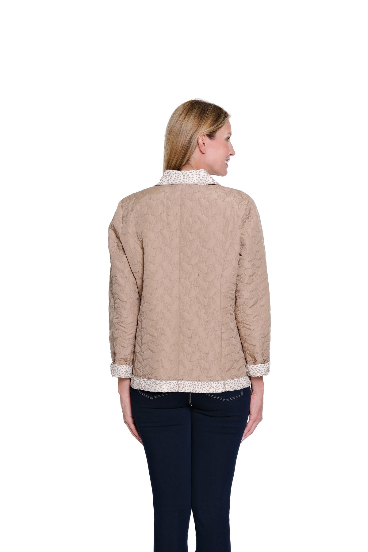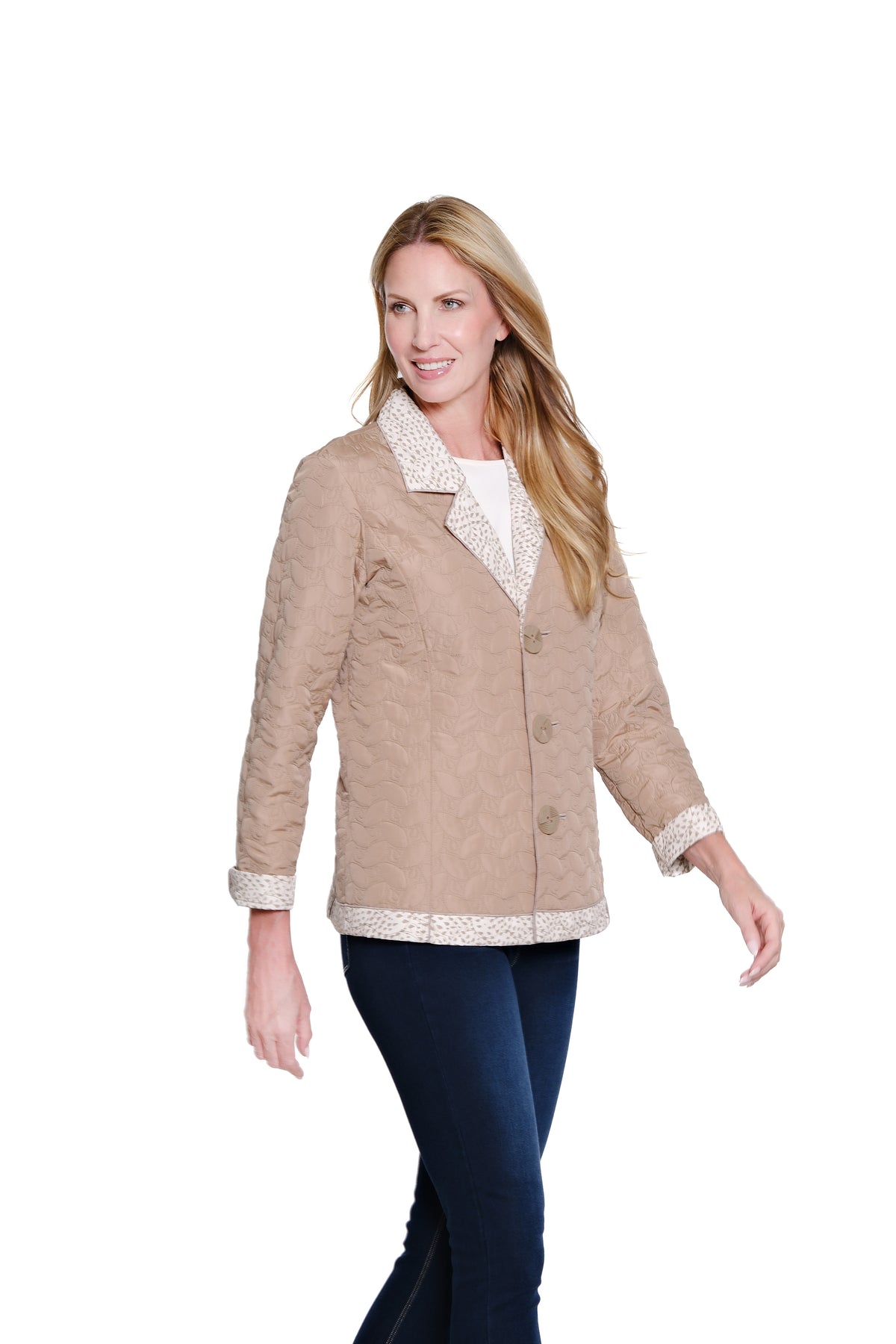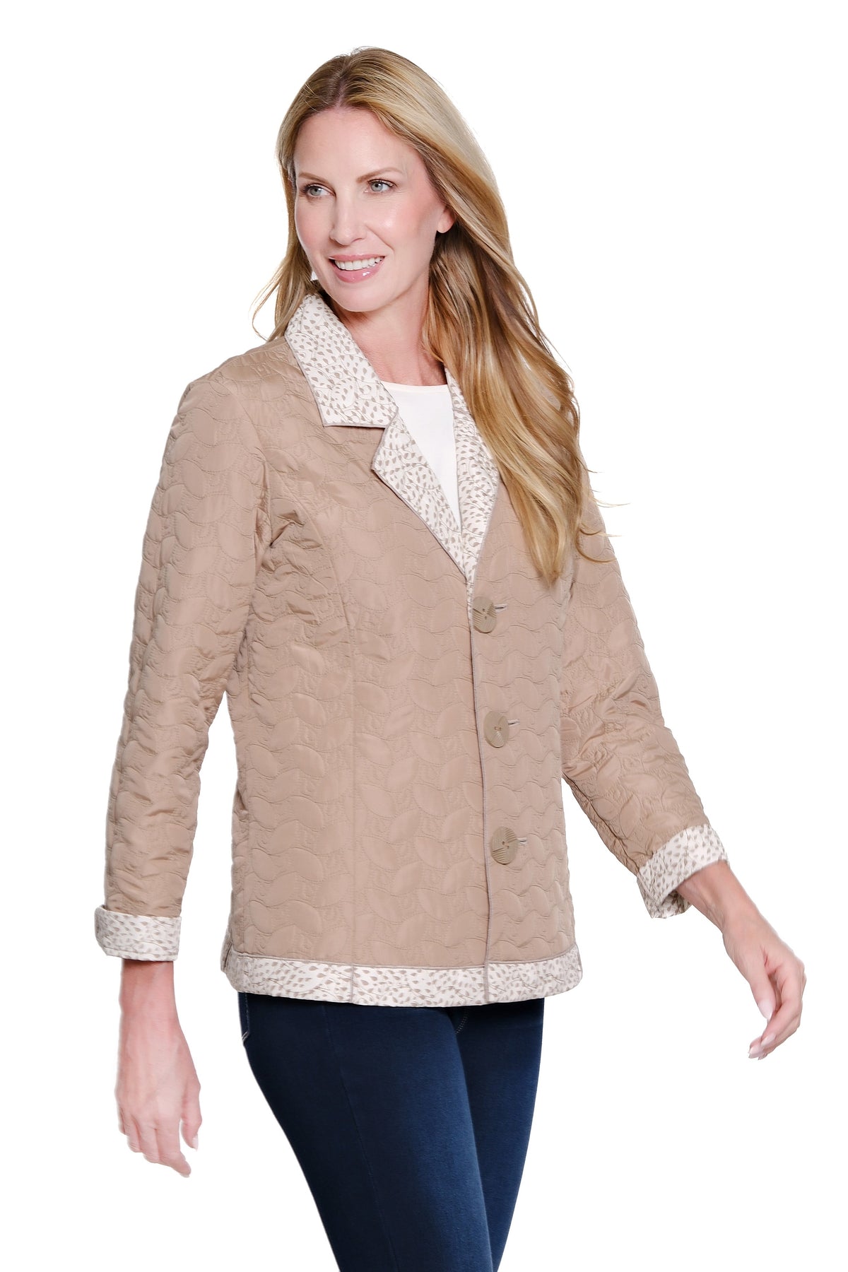 This versatile quilted jacket offers two looks in one with its reversible design. Featuring a classic lapel collar and button-front closure, it pairs a solid side with a printed reverse for easy style changes. Crafted from lightweight woven poly fabric, this jacket provides cozy warmth while remaining perfect for everyday layering.