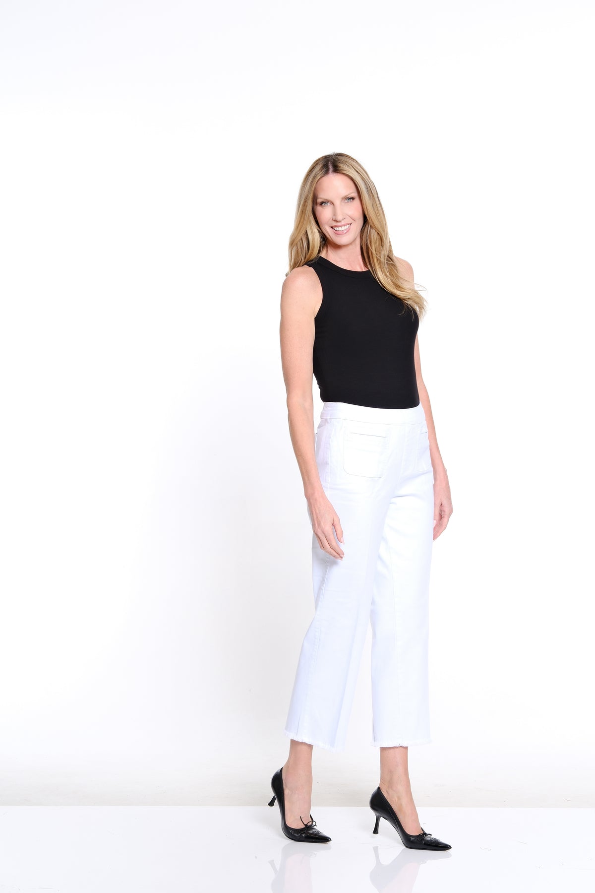 Effortlessly polished with relaxed charm, this wide-leg denim crop jean is designed with a comfortable pull-on elastic waist for easy, flattering wear. Four-pocket styling keeps the look classic, while a fringe hem adds subtle texture and modern character. Crafted in a cotton-spandex blend, it offers breathable comfort with gentle stretch for everyday ease.