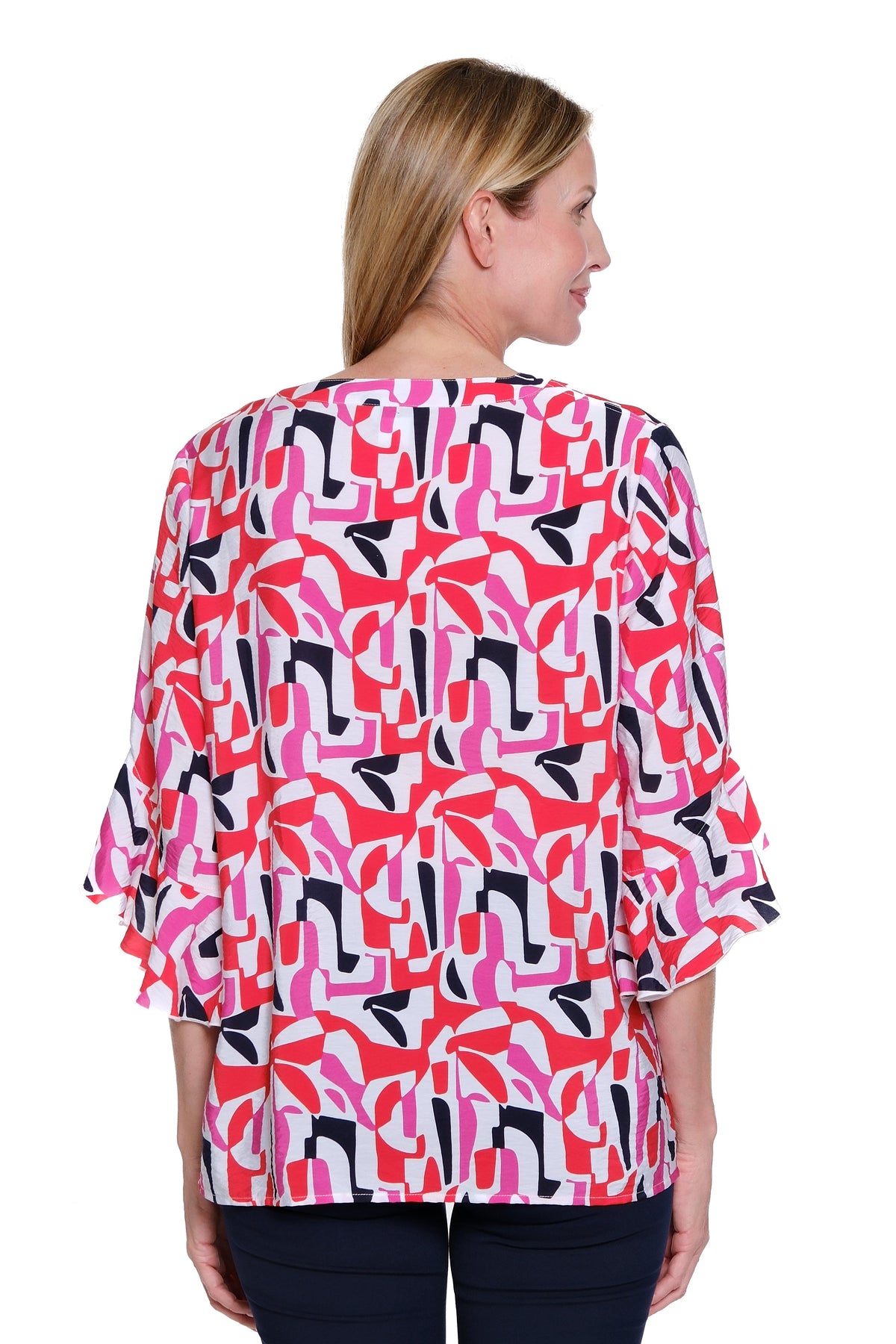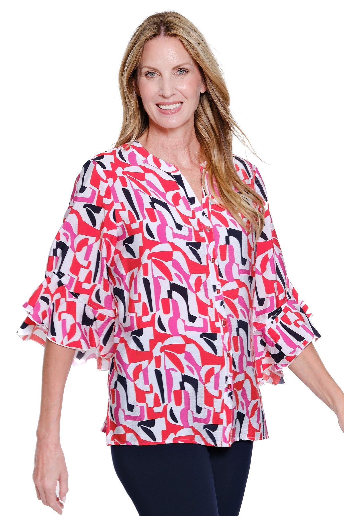 Softly expressive with graceful movement, this printed popover top is crafted in textured crinkle fabric for effortless elegance. A clean band collar and front placket lend subtle structure, while elbow-length flounce sleeves add fluidity and feminine charm. Designed with an easy pullover silhouette and finished in a smooth rayon-nylon blend, it drapes beautifully for polished, everyday wear.