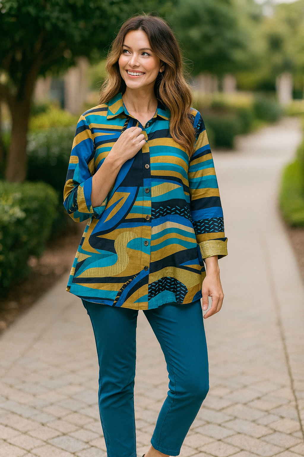 Effortlessly refined and endlessly wearable, this printed woven shirt brings easy sophistication to your everyday look. Crafted from a soft rayon-nylon blend, it drapes beautifully while offering a breathable, lightweight feel. The 3/4 sleeves with turn-up cuffs and a polished button-front design make it perfect for layering or wearing solo.